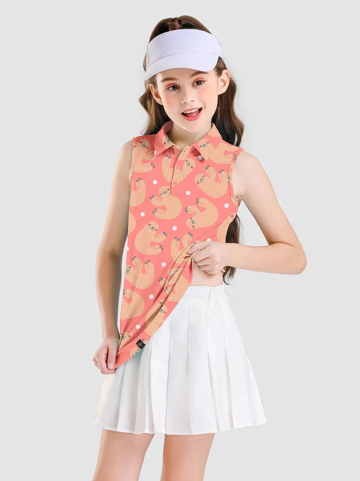 Pink Sloth Button-placket Sleeveless Polo Shirt for Girls