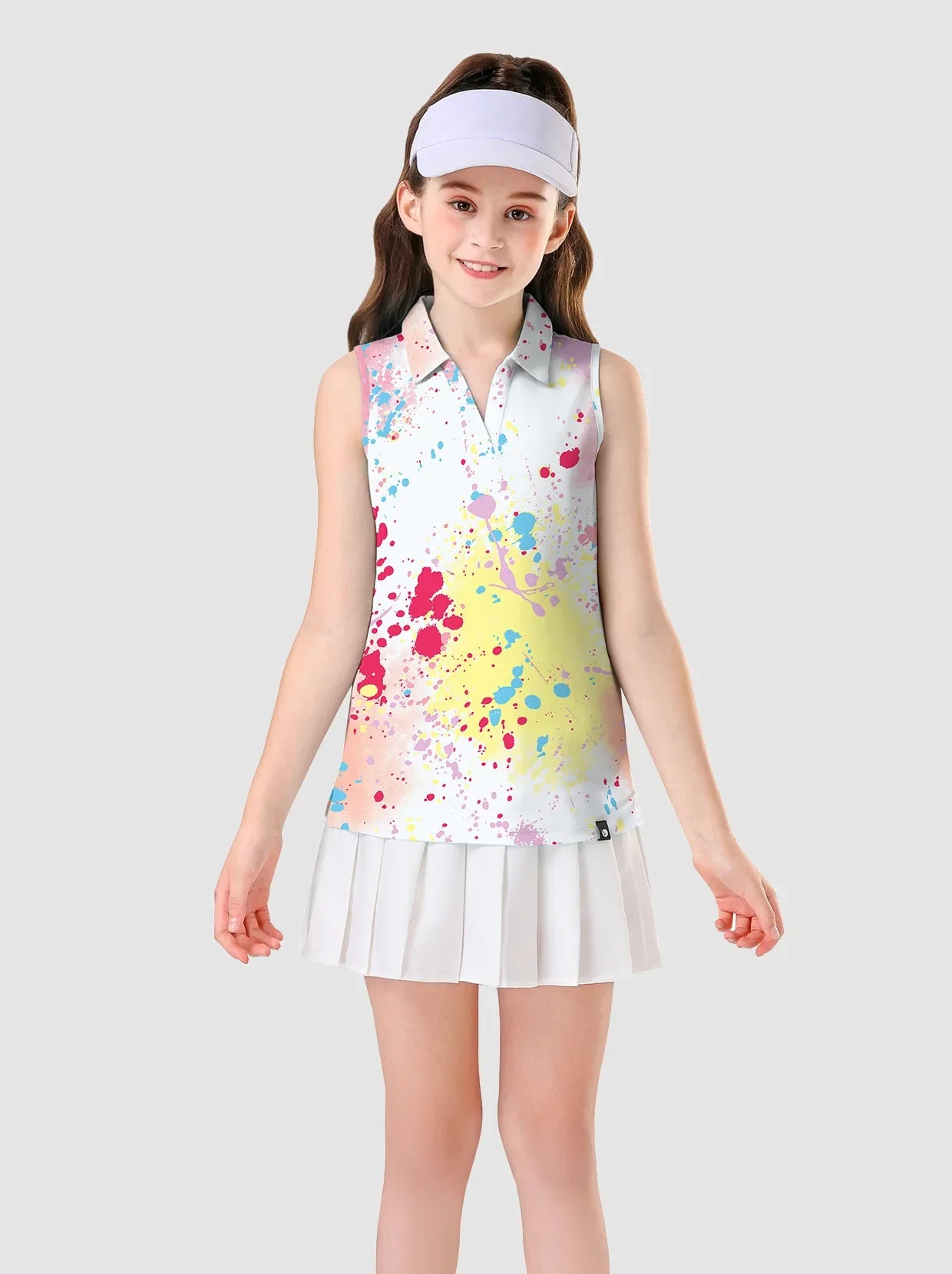 Girls Multicolor Splatter Print V-neck Sleeveless Polo Shirt