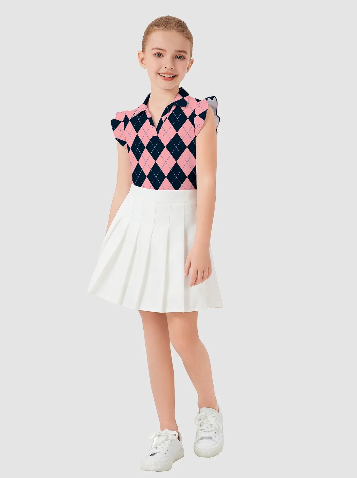 Pink Checkerboard V-neck Sleeveless Polo Shirt for Girls
