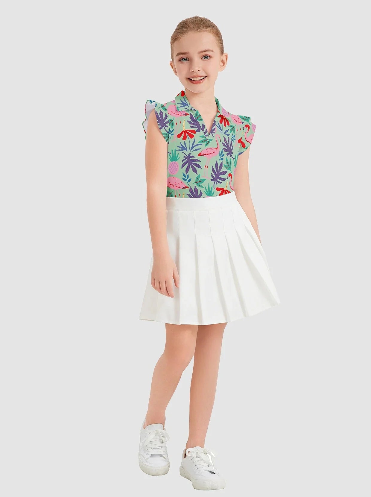 Flamingo and Leaf Print V-neck Ruffled Sleeveless Polo Shirt for Girls
