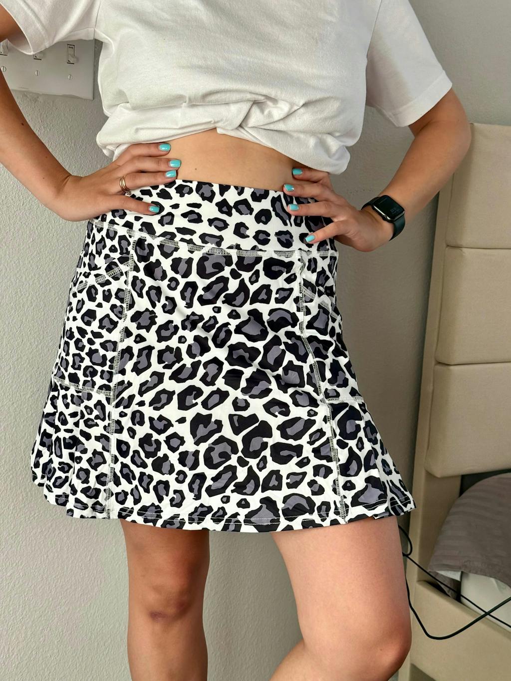Enjoy all-day comfort and protection from the sun with our UPF50+, leopard pleated skorts. Made with soft and moisture-wicking material, our active skort also offers the convenience of built-in shorts and pockets, perfect for all your favorite activities and casual outings. The leopard pattern adds a touch of personality to this versatile piece.