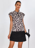 Leopard Print Quarter-zip Ruffled Short-sleeve Polo Shirt for Women