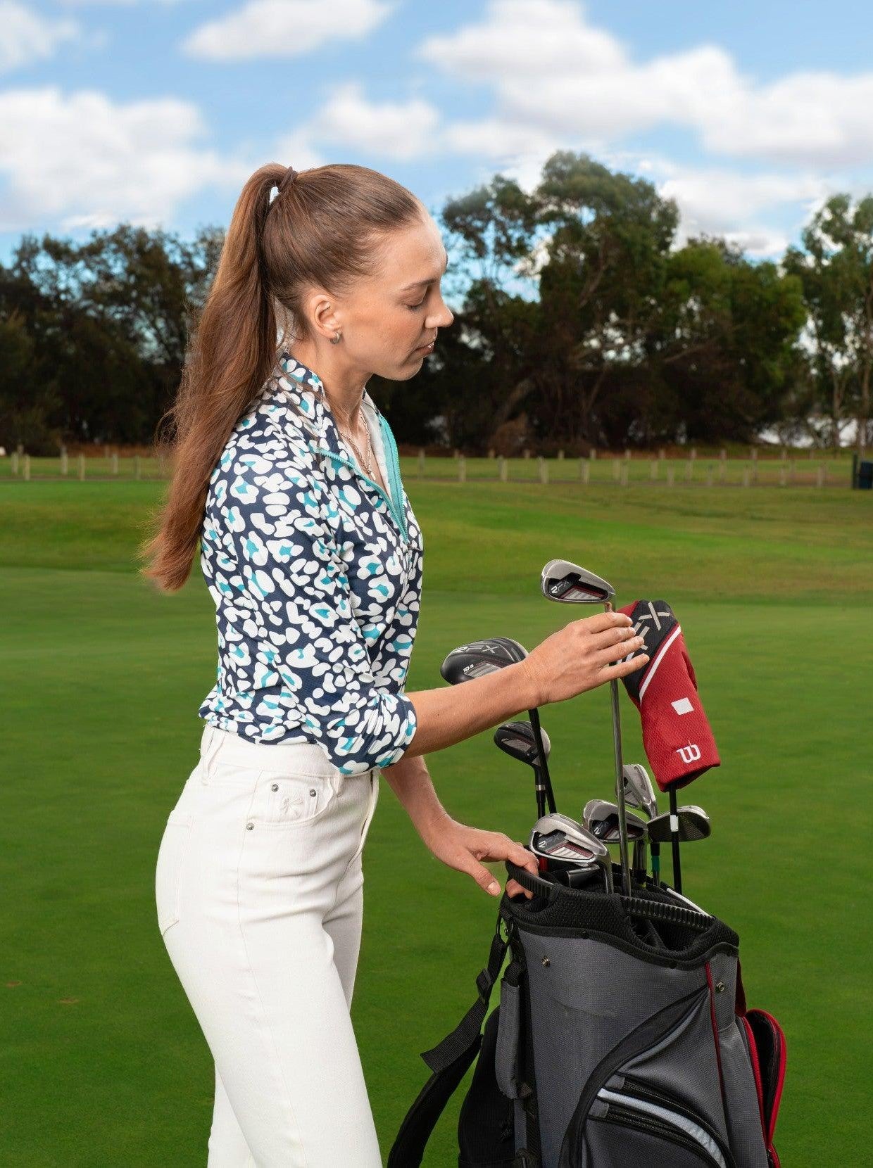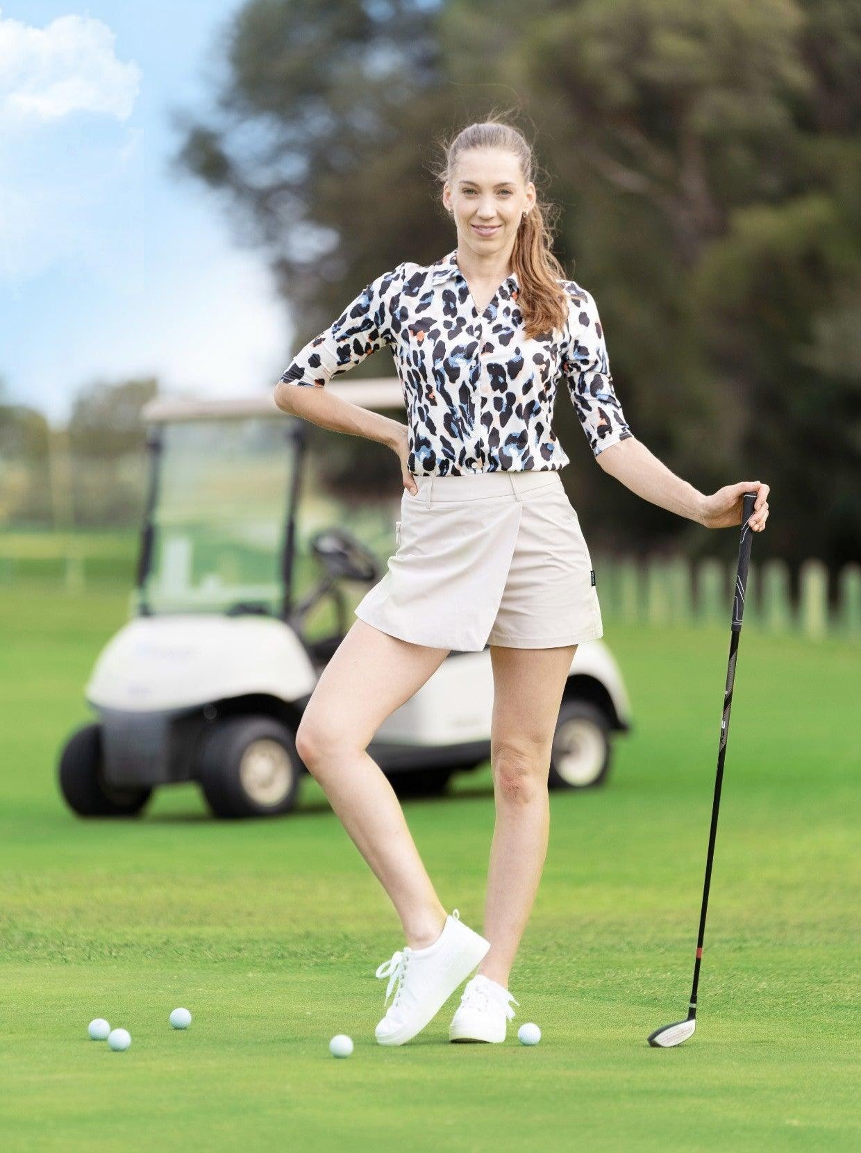 Create effortlessly stylish golf ensembles by combining our shirts with our A-line golf skorts, resulting in adorable and chic outfits that capture attention on the green. With our leopard shirts, you can shift seamlessly from the courses to clubhouses, coffee shops, shopping malls, offices, and outings.