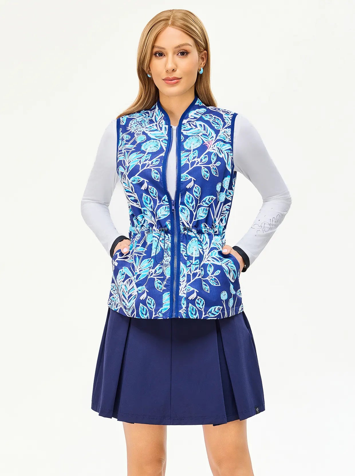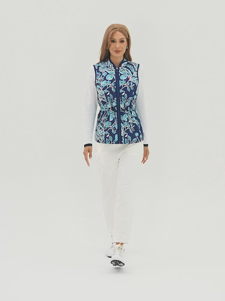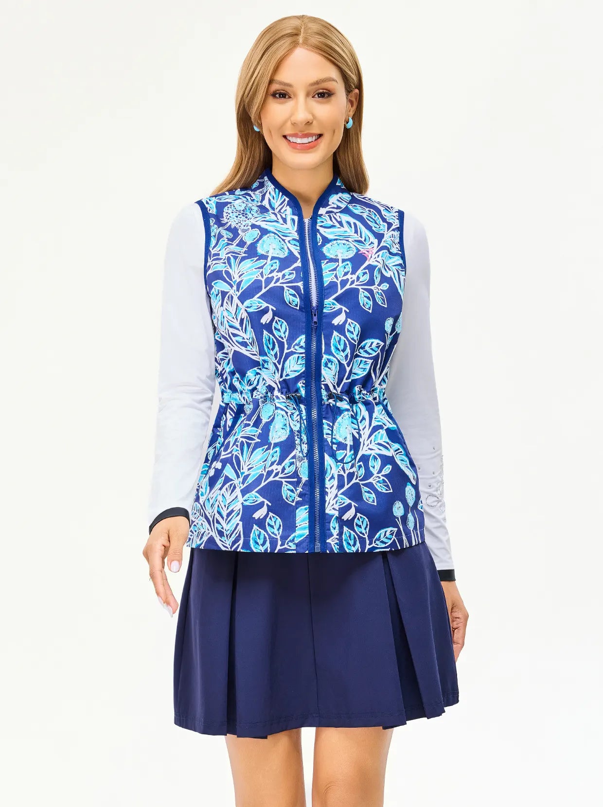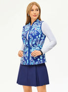 Swing into style with this sleek blue vest from our Love at First Swing Collection. This lightweight vest features water-repellent fabric to keep you dry in light rain, along with a curved stand collar for effortless layering. With a charming blue petal prelude pattern, this unrestricted vest transitions seamlessly from the fairway to everyday adventures.