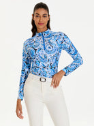 Add a touch of classic charm to your wardrobe with our Blue Paisley Shirt. This long-sleeve, quarter-zip top with a stand collar is both stylish and functional. The moisture-wicking, breathable fabric ensures maximum comfort, while the raglan sleeves and stretch material provide a great fit. Perfect for golf, tennis, or adding a sophisticated print to your casual look.