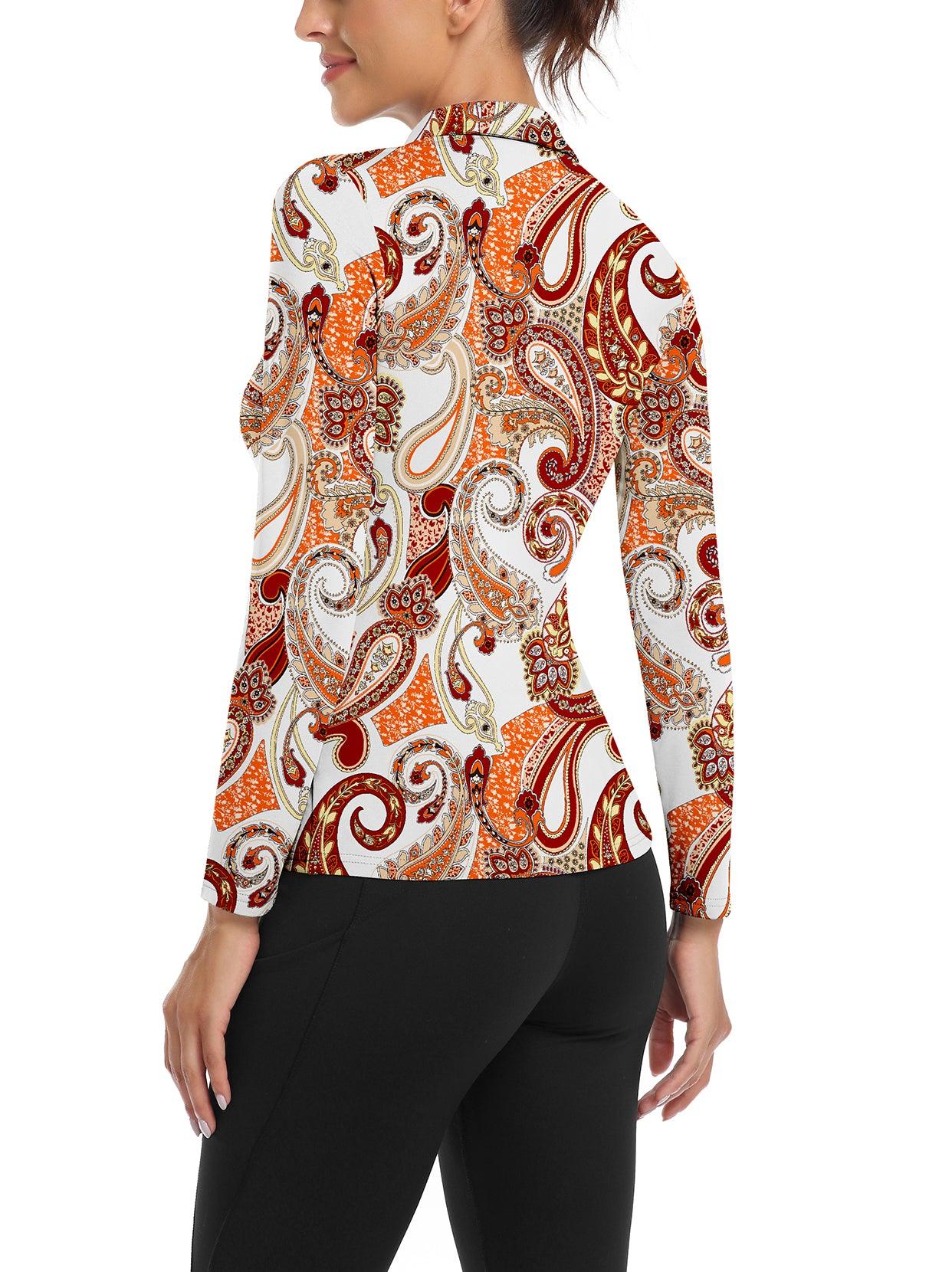Ladies Long Sleeve Golf Polo - Red Retro Large Flower Golf Shirt Moisture Wicking Long Sleeve Shirt Half Zip Pullover Athletic