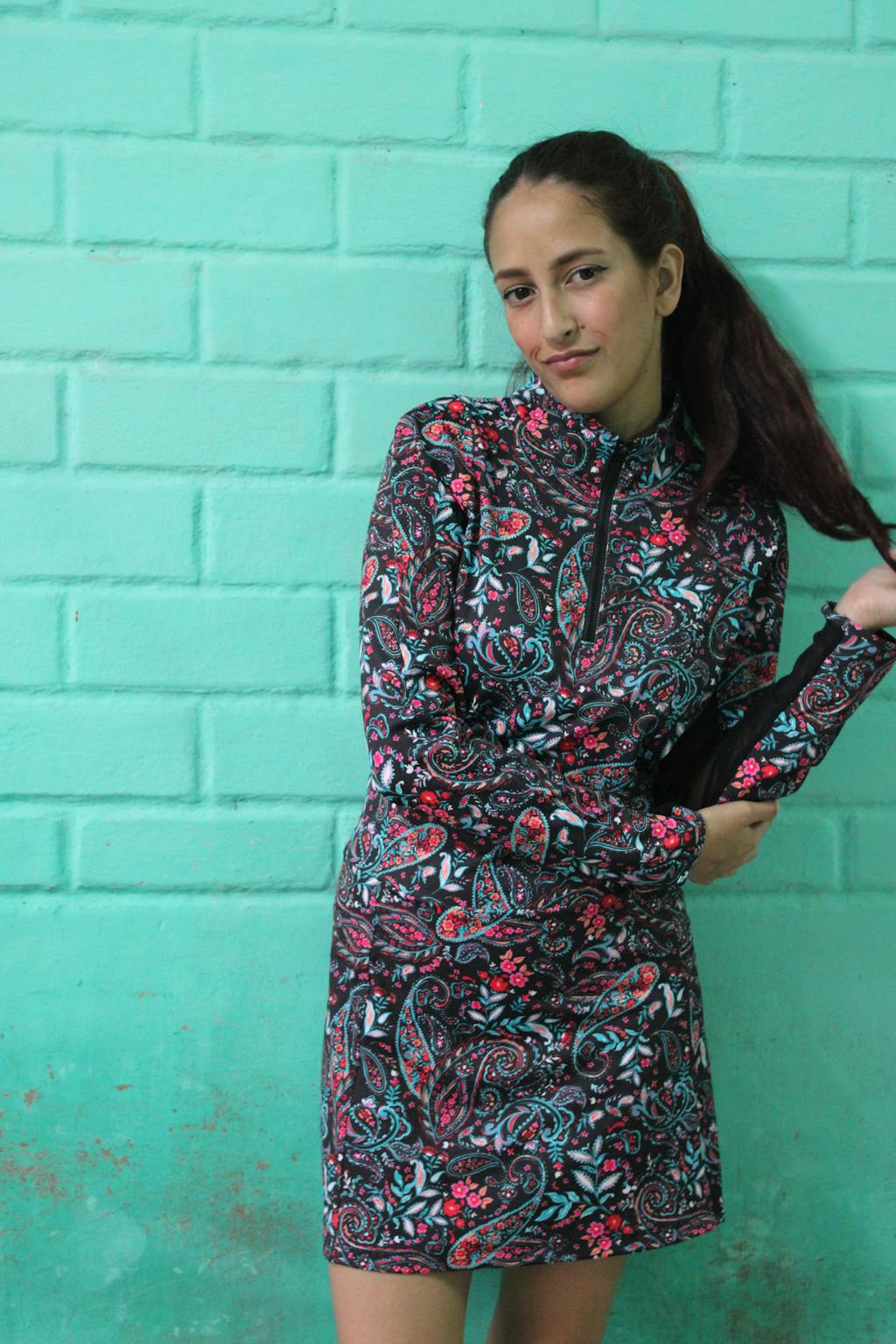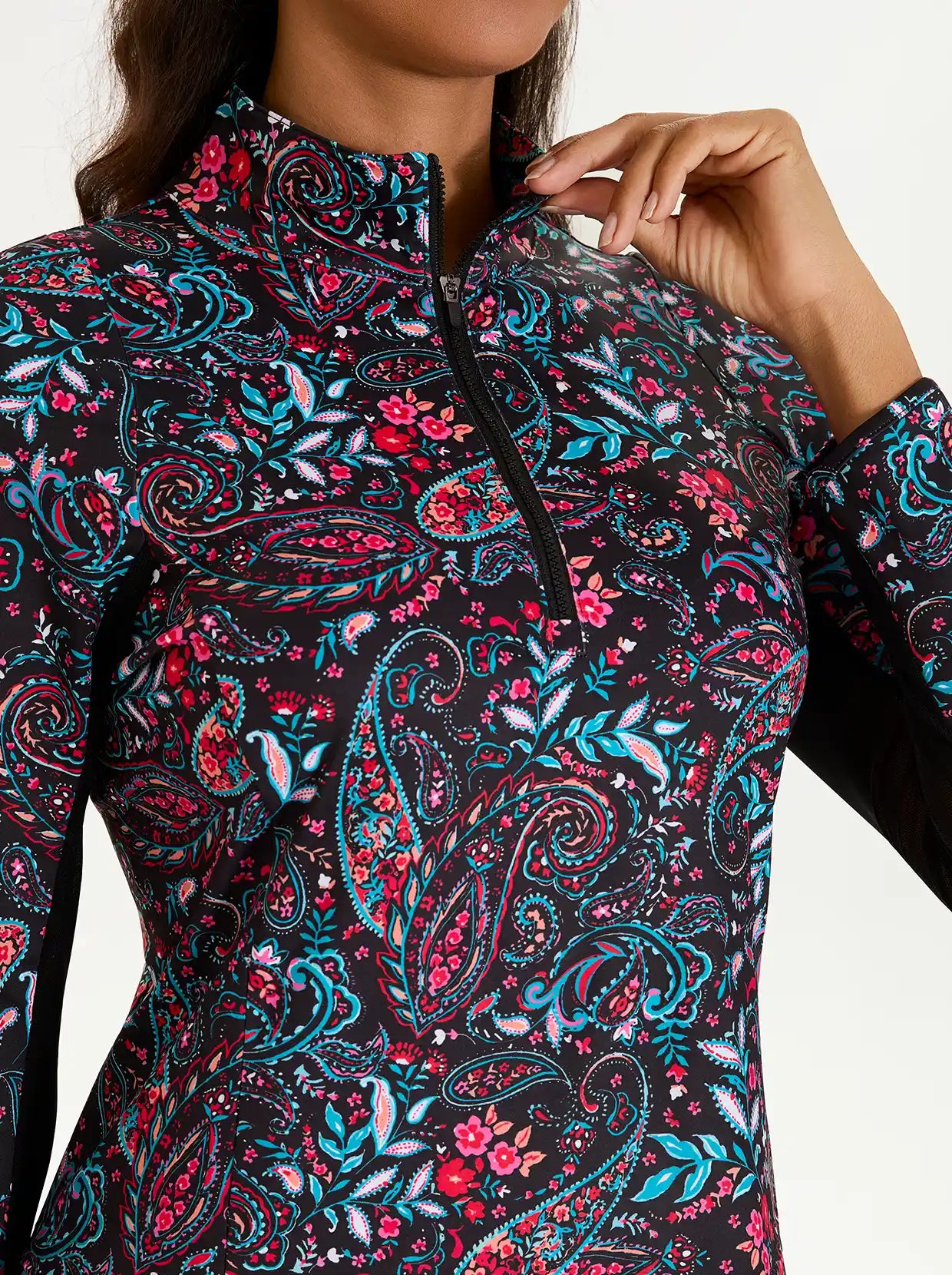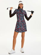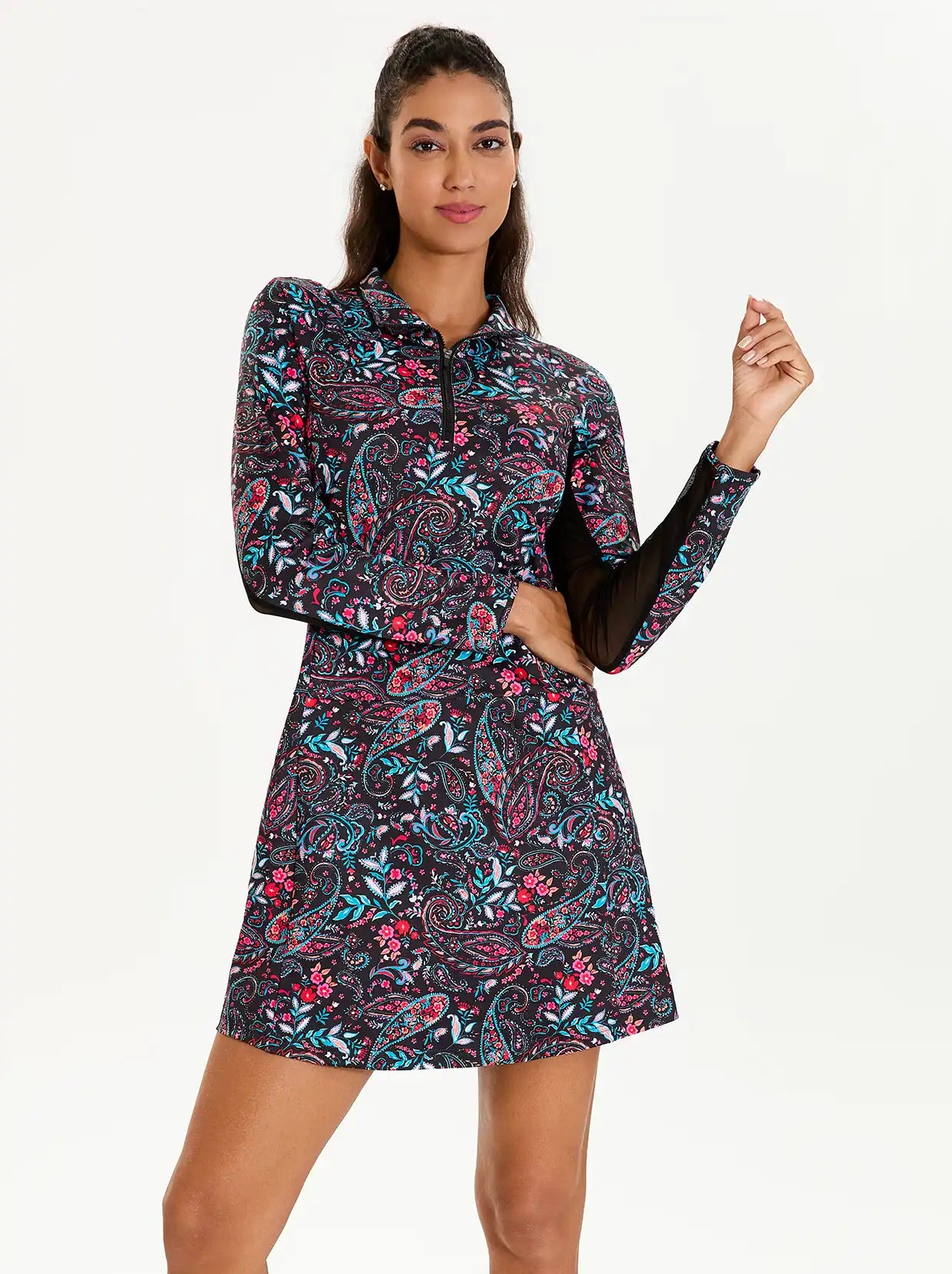 Bye-bye, sweaty arms! Elevate your game and style with our Black Paisley Quarter-Zip Long-Sleeve Dress! This stunning dress features a vibrant, eye-catching paisley print set against a sleek black backdrop. Crafted from soft, 4-way stretch fabric, it offers ultimate comfort and freedom of movement. Designed with half-breathable mesh sleeves, pockets, and built-in shorts, plus a stand collar with a quarter-zip.