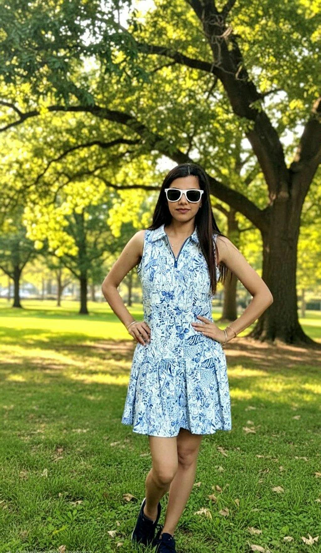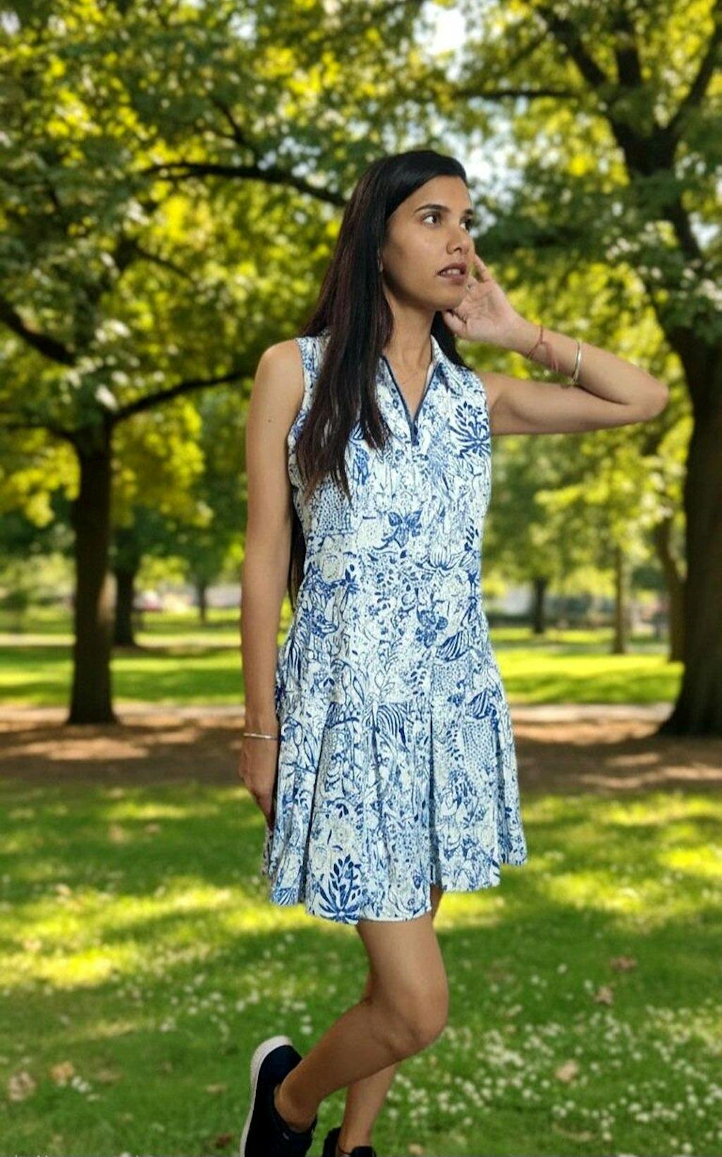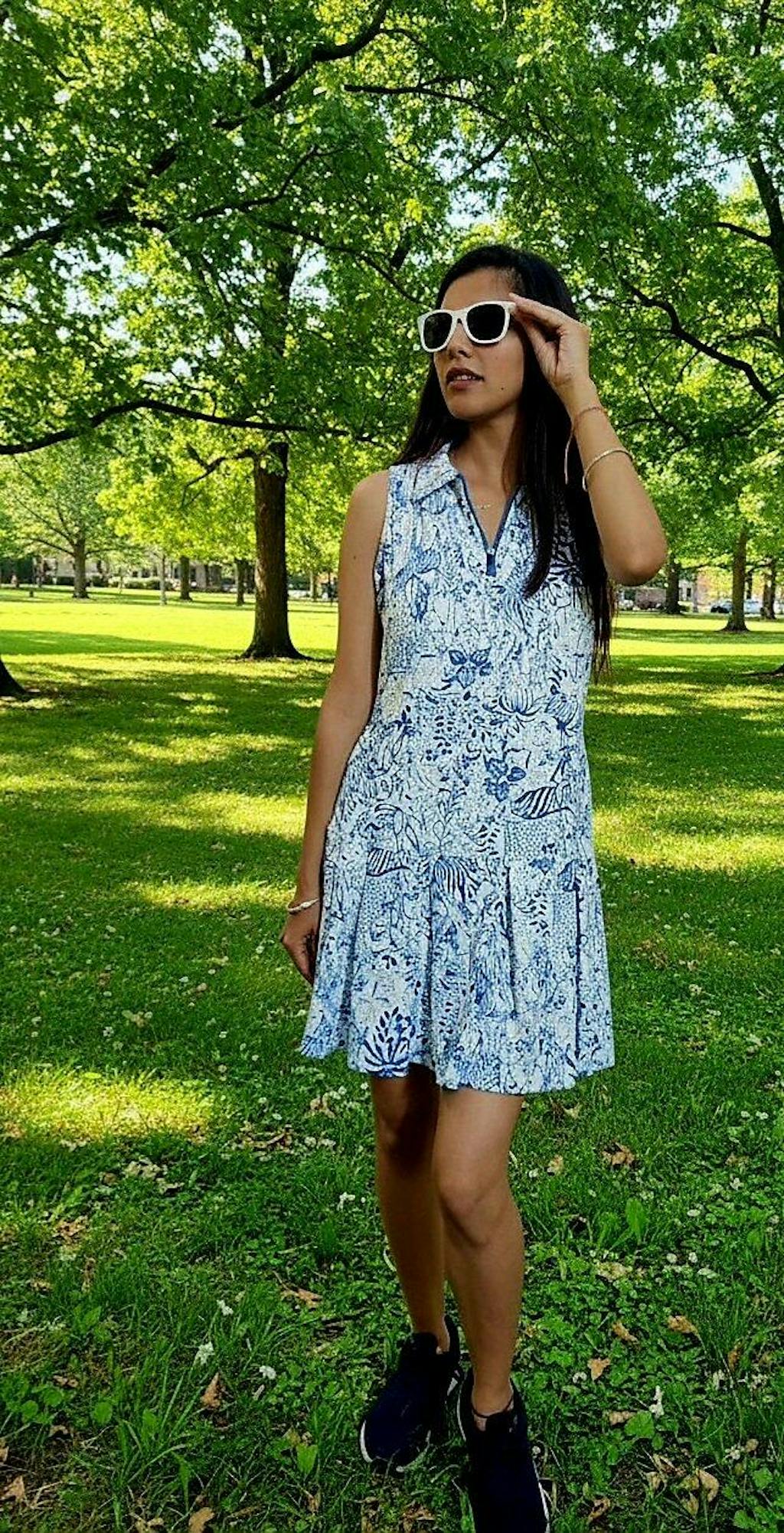 Embrace the wild with our sleeveless pleated dress from our Call of the Wild Collection. Crafted from a 4-way stretch fabric with a striking blue wildlife print, this dress offers flexible freedom. Perfect for your next round, this is the ultimate women's golf dress.