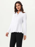 Elevate your everyday look with this chic peplum polo. The crisp button-down front and flattering peplum hem work together to create an instantly polished silhouette. Crafted from lightweight, breathable fabric with 4-way stretch and quick-dry technology, it's ready for whatever your day throws at you. Comfort meets style in one seriously versatile piece.