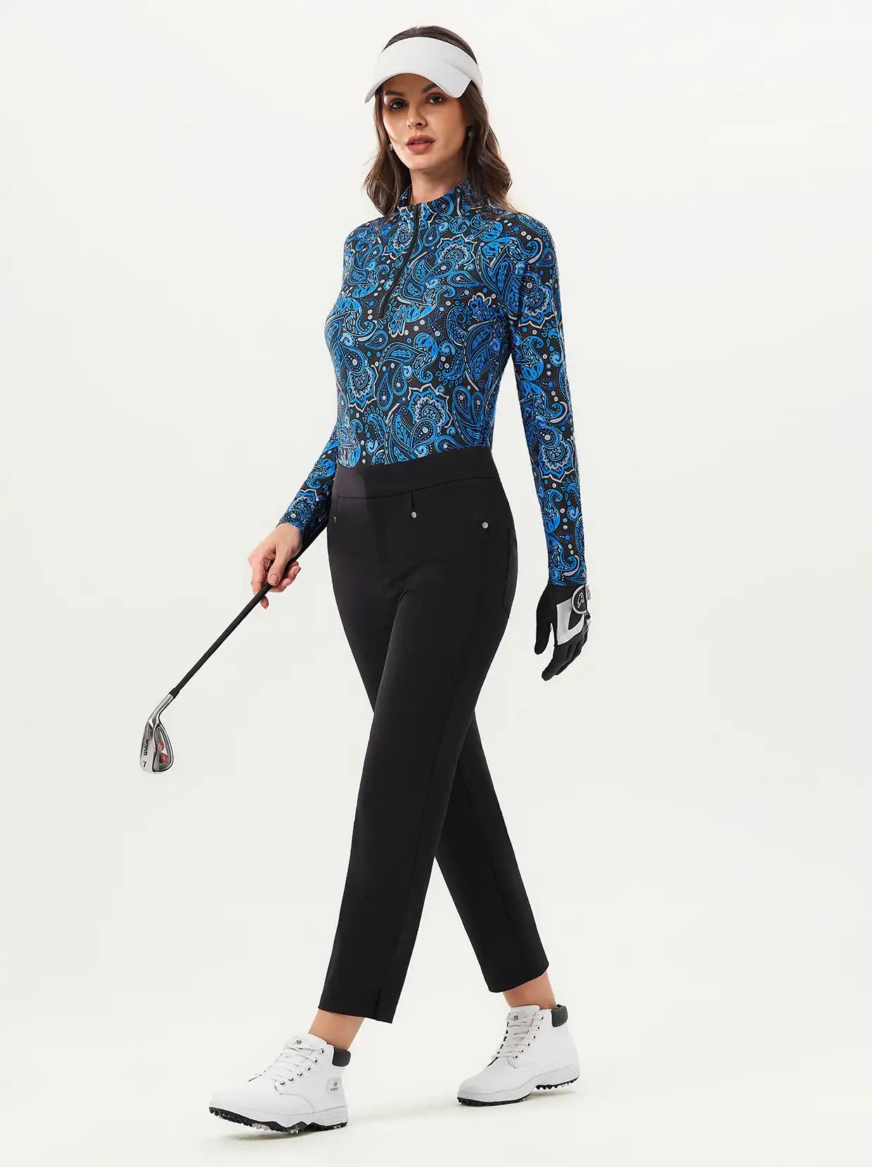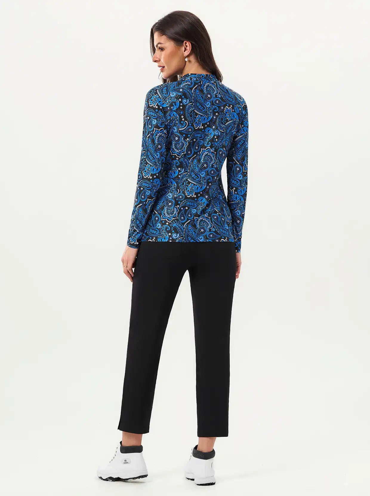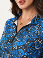 Rock the fairway or the streets in this Blue and Black Paisley Quarter-zip—where retro print meets modern performance. Featuring a crisp stand collar, raglan sleeves, and a stretch fabric blend that moves with you, this golf polo shirt keeps things cool and comfortable all day long. The moisture-wicking fabric keeps you cool and dry.. Classic paisley never goes out of fashion.