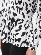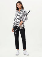 Effortlessly merge bold style with athletic comfort. This eye-catching black-and-white cow print top features a polished button-down collar and a figure-sculpting curved peplum hem for an instantly flattering fit. Crafted with high-stretch, moisture-wicking fabric, it keeps you cool, dry, and ready for the court, the course, or your next stylish appearance.