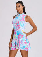 From our Ocean Breeze Collection, this 34" sleeveless dress, with its vibrant "Coral Mirage" print and chic stand collar, offers effortless coastal charm. Integrated shorts ensure freedom of movement. Crafted for comfort, it lets you confidently embody summer's playful spirit and express your unique style on and off the green.