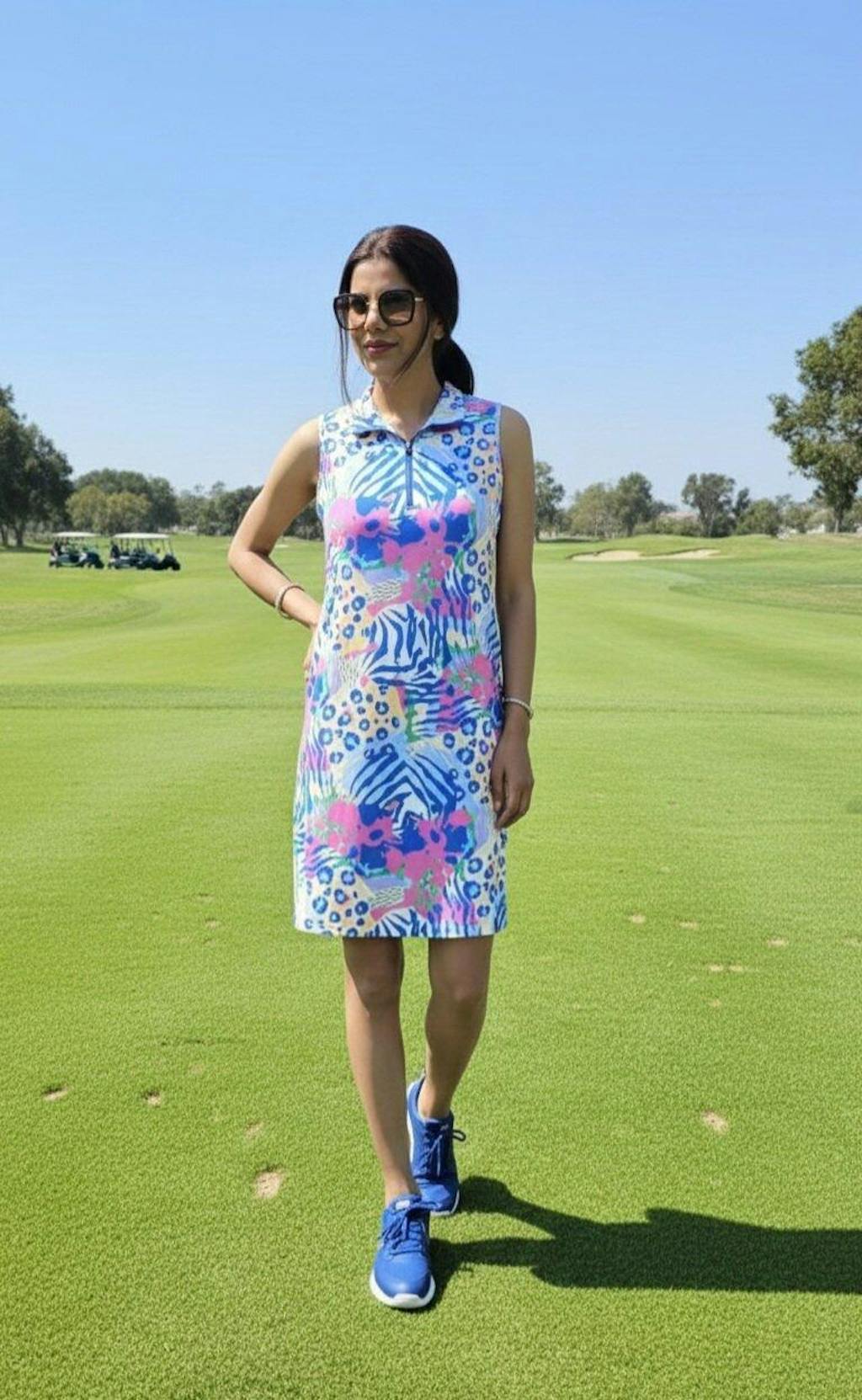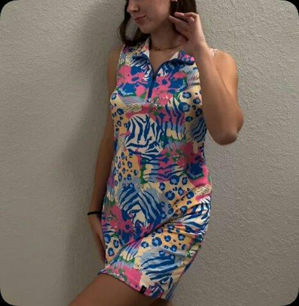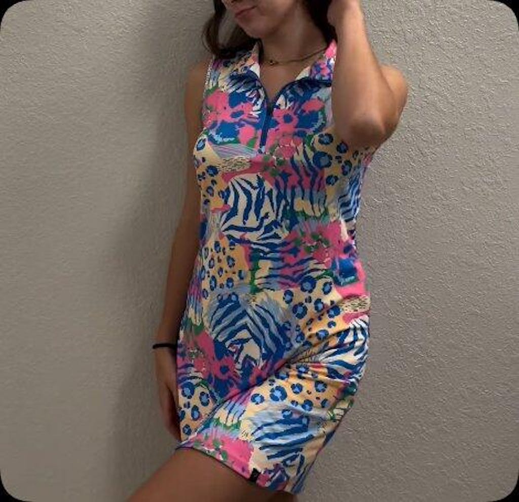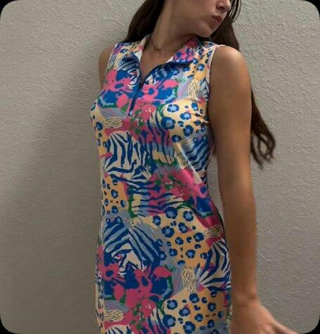 .Unleash your inner nature with this tropical leopard print dress from our Call of the Wild Collection. This women's golf dress features a chic stand collar and a functional sleeveless design, blending fierce style with practical comfort. Discover more sleeveless dresses with pockets in our collection.