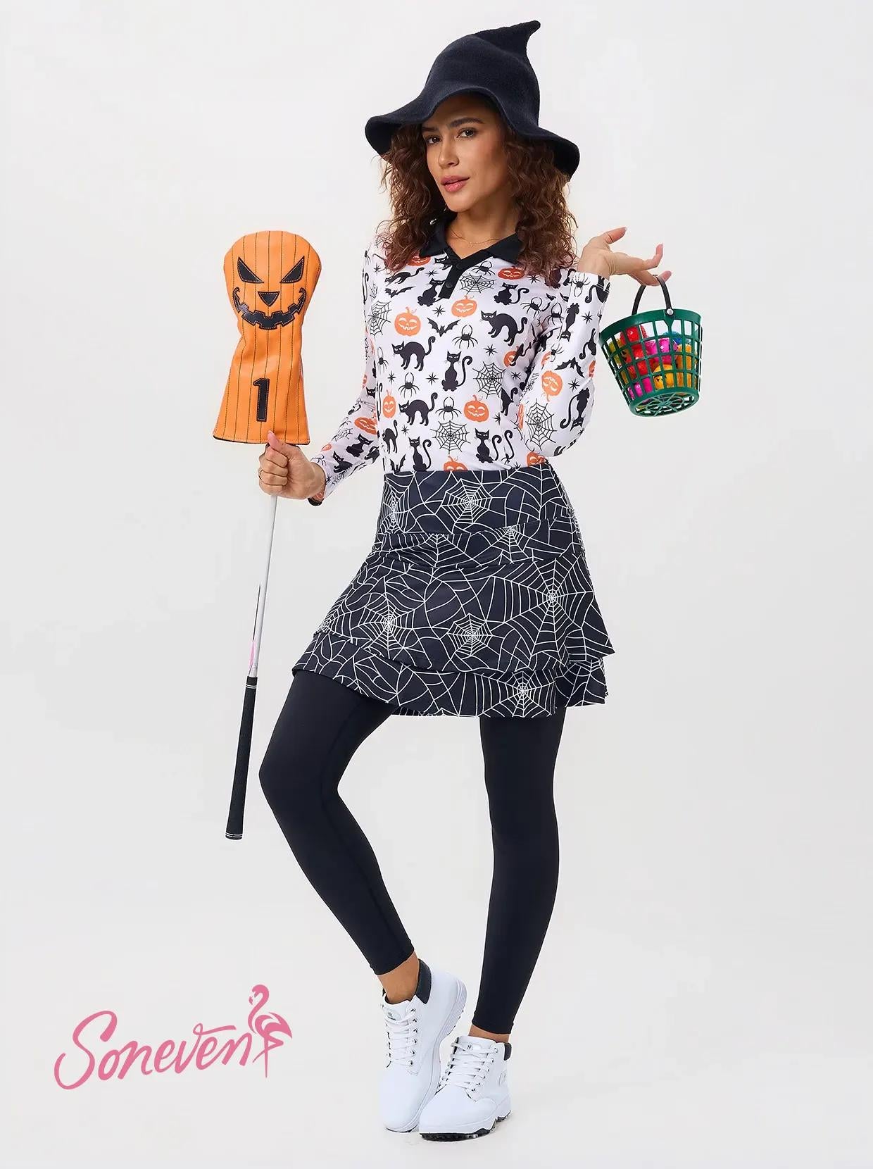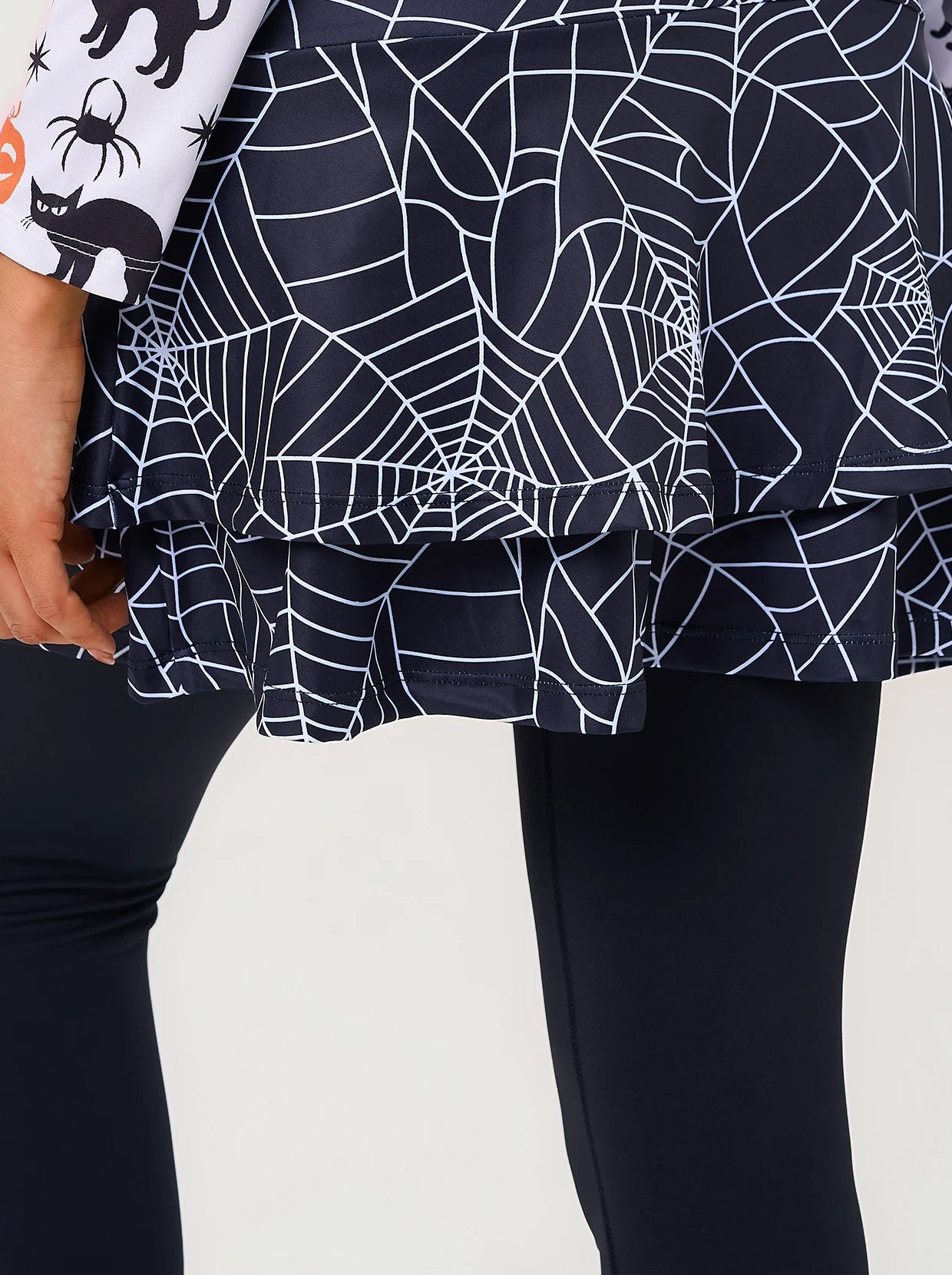 Spin a spooky look for Halloween! Our black athletic skirted leggings with a classic cobweb print are ready for the season. Crafted from a soft, breathable, and stretchy fabric, they provide all-day comfort and moisture-wicking performance. The double-layer design offers both coverage and flair, while side pockets keep your essentials secure.