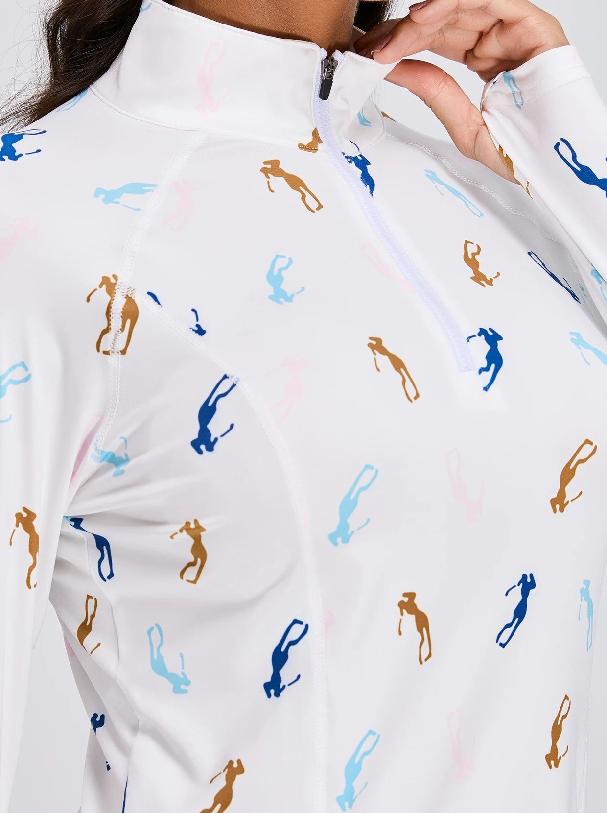 Take your game to the next level with our golfer print quarter-zip shirt. Made from a soft and breathable fabric, it boasts thumb holes and raglan sleeves for maximum comfort and freedom of movement. The stand collar and quarter-zip provide a touch of style, while the pockets add functional storage for your essentials. With its versatile design and 4-way stretch, this shirt is perfect for golf, tennis, pickleball, and casual wear. Look and feel your best on and off the course with this must-have piece.