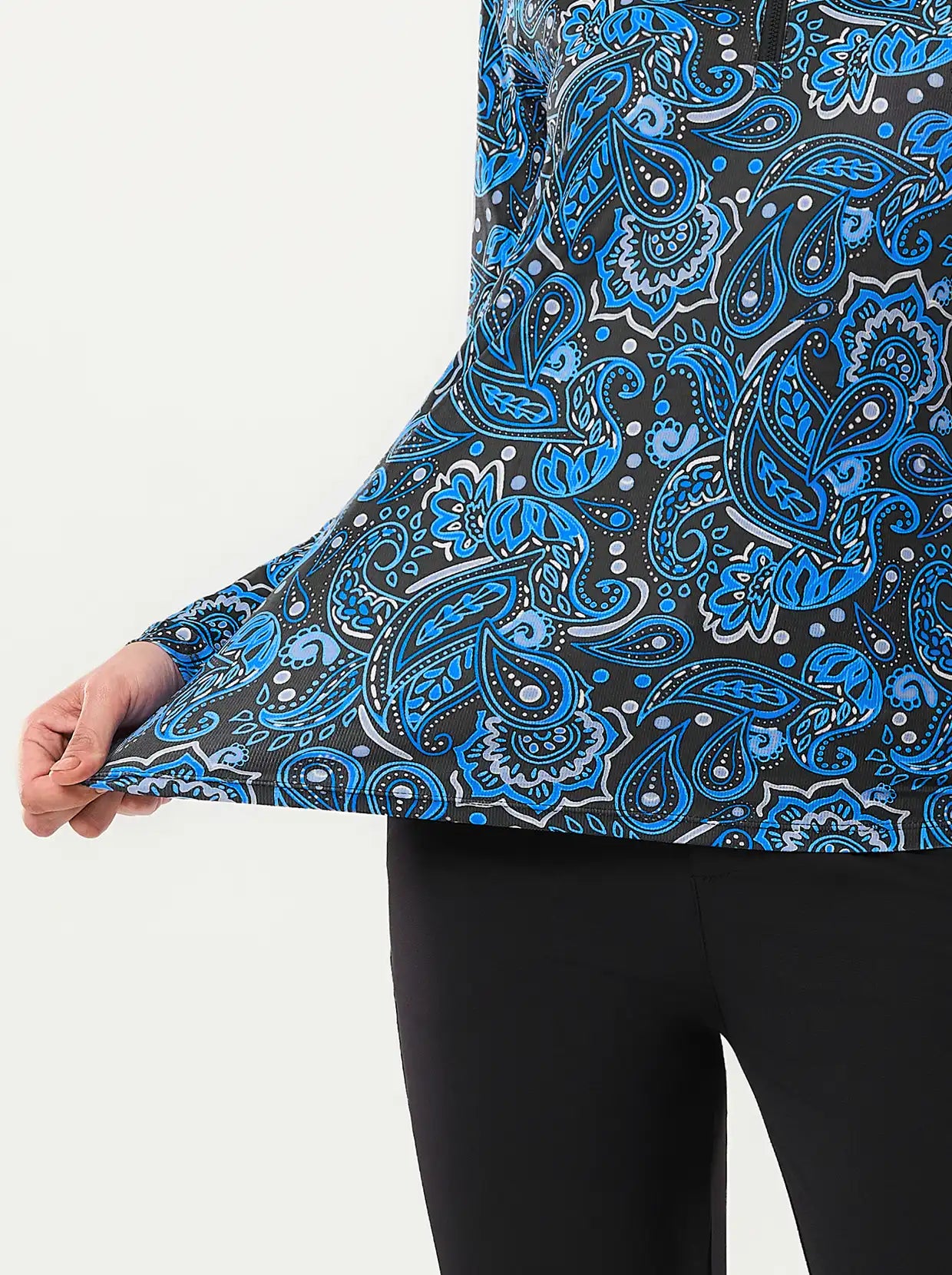 Rock the fairway or the streets in this Blue and Black Paisley Quarter-zip—where retro print meets modern performance. Featuring a crisp stand collar, raglan sleeves, and a stretch fabric blend that moves with you, this golf polo shirt keeps things cool and comfortable all day long. The moisture-wicking fabric keeps you cool and dry.. Classic paisley never goes out of fashion.