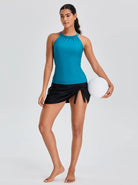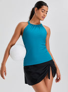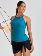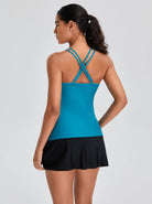 Peacock Blue Ruffled-sleeve Crisscross Back Tankini Top with Built-in Bra