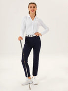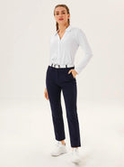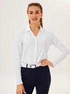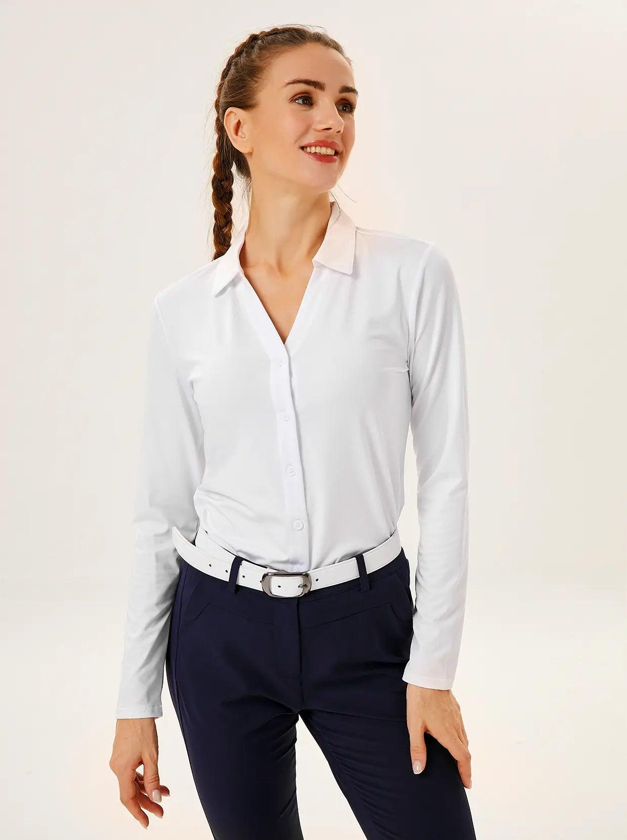 Elevate your style on and off the course with our Solid White V V-neck long-sleeve Golf Shirt for Women. Made with high-quality fabrics, this shirt provides ultimate comfort and a streamlined fit. Its UPF50+ (UVA/UVB) protection makes it perfect for outdoor activities, while the button-down V-neck and long-sleeve design give it a versatile look for any occasion. Whether you're hitting the links, running errands, or dressing for a casual work day, this shirt has got you covered.