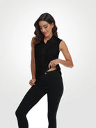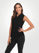 Solid Black Button-Down Sleeveless Polo Shirts For Women