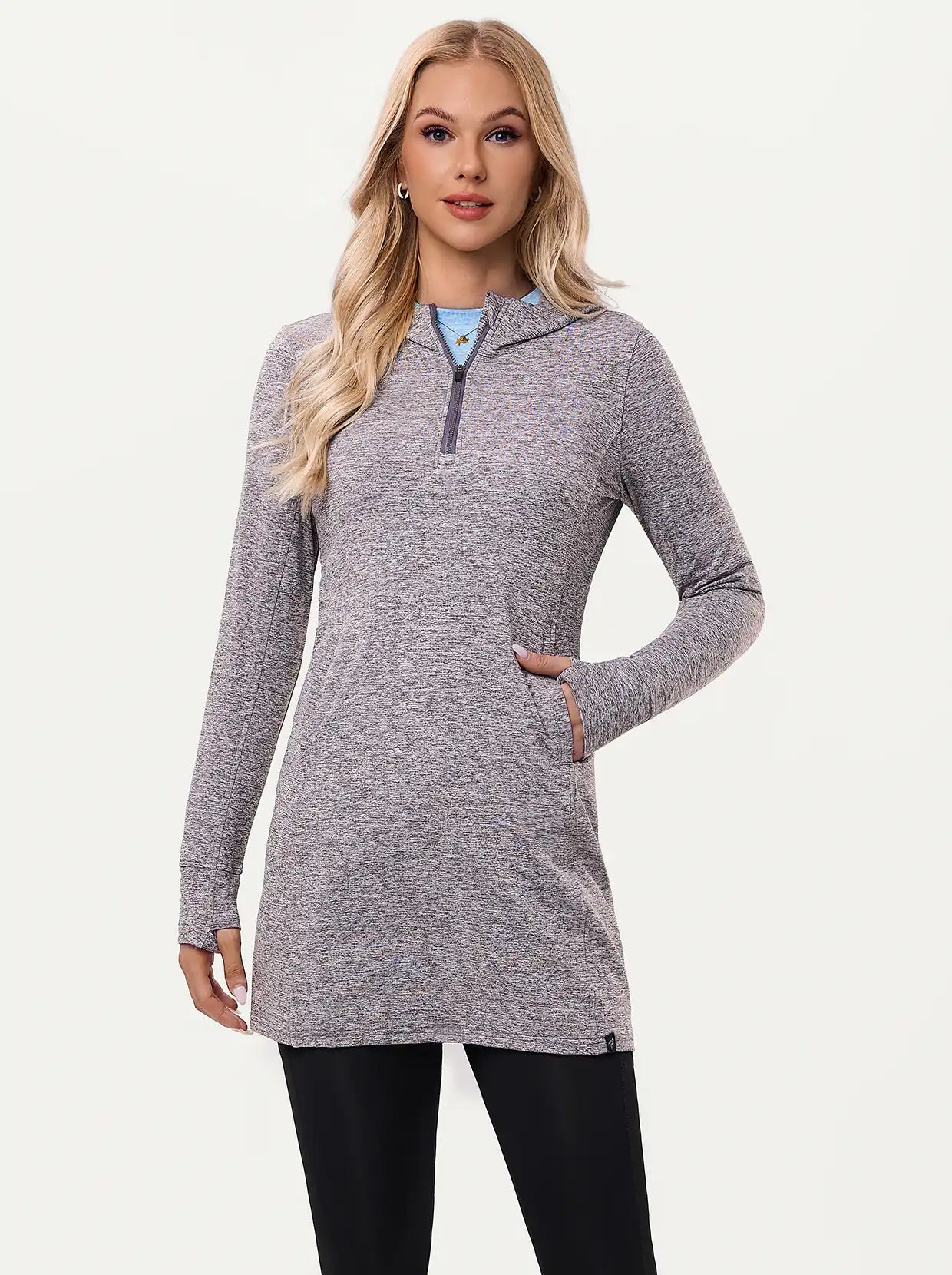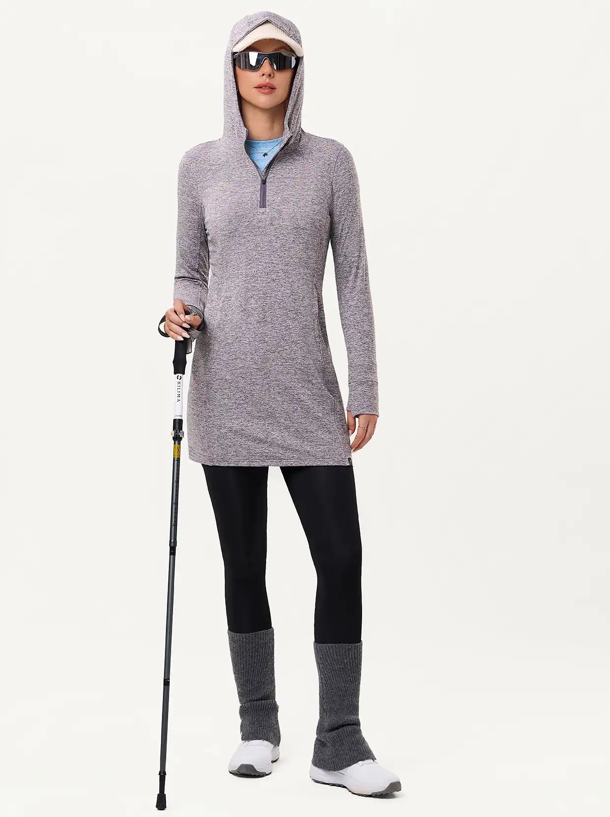 Stay cozy in our Quarter-Zip Hooded Long-Sleeve Fleece Dress. Designed for comfort, it features heat retention, soft fleece lining, and fade-resistant fabric. The hoodie adds extra protection, while pockets provide convenient storage. With thumbholes to keep sleeves in place and stretchy features for a comfortable fit, this dress is perfect for layering on chilly days.