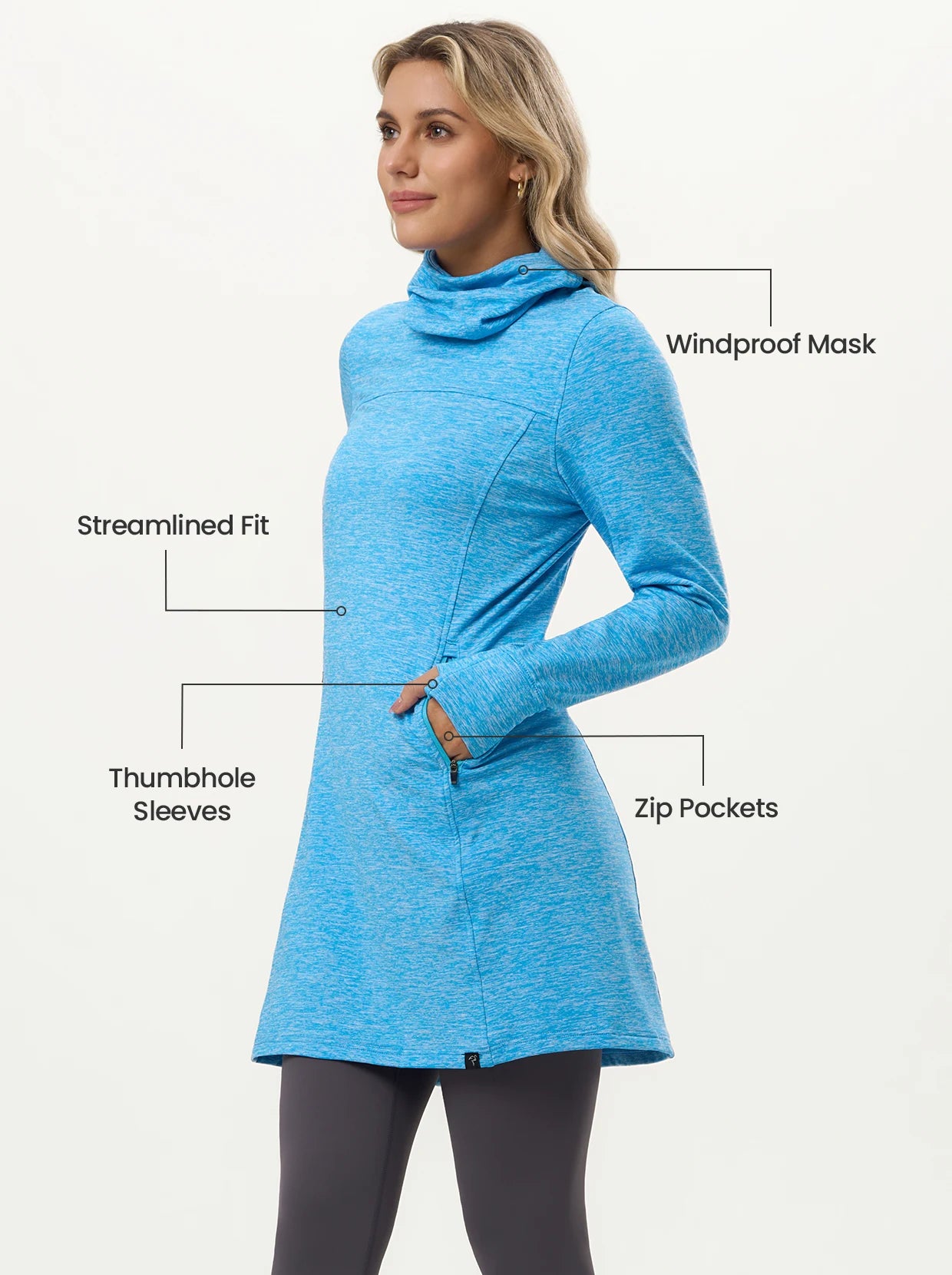 Meet your versatile go-to dress for winter adventures! This versatile thermal pullover dress delivers comfortable warmth and instant protection from the elements. Featuring a windproof mask and thumbholes, it's engineered to keep you cozy from head to wrist. A built-in pocket securely holds your essentials, making it the perfect piece for the golf course, pickleball court, or simply conquering your everyday routine.