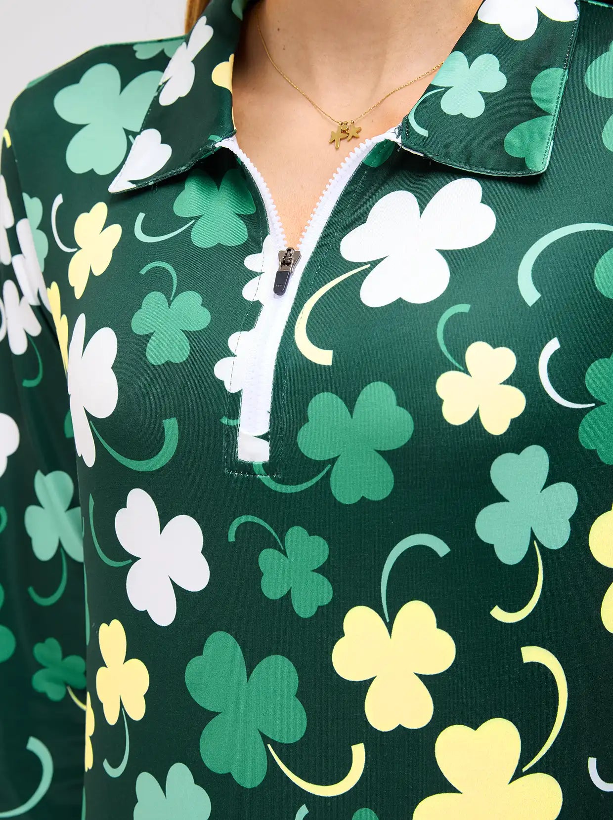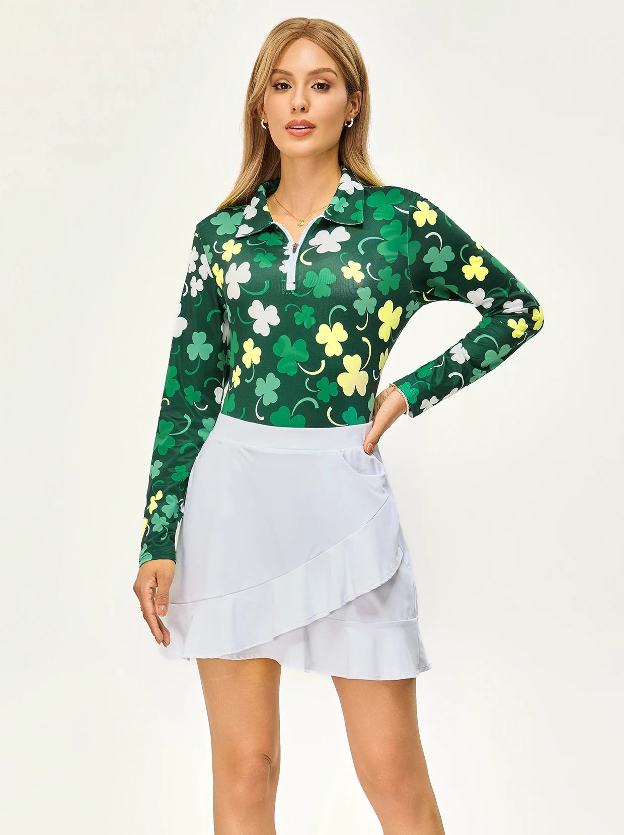 White and Green Shamrock Quarter-zip Short-sleeve Polo Shirt for Women