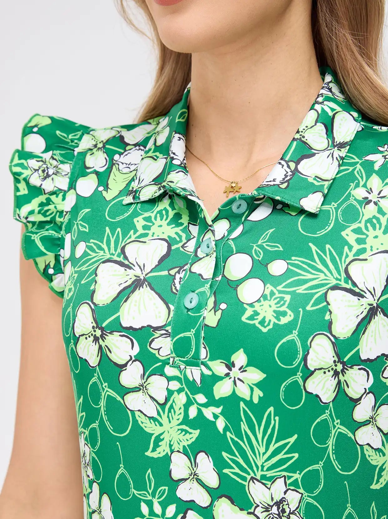 Shamrock and Floral Button-placket Ruffed Sleeveless Polo Shirt