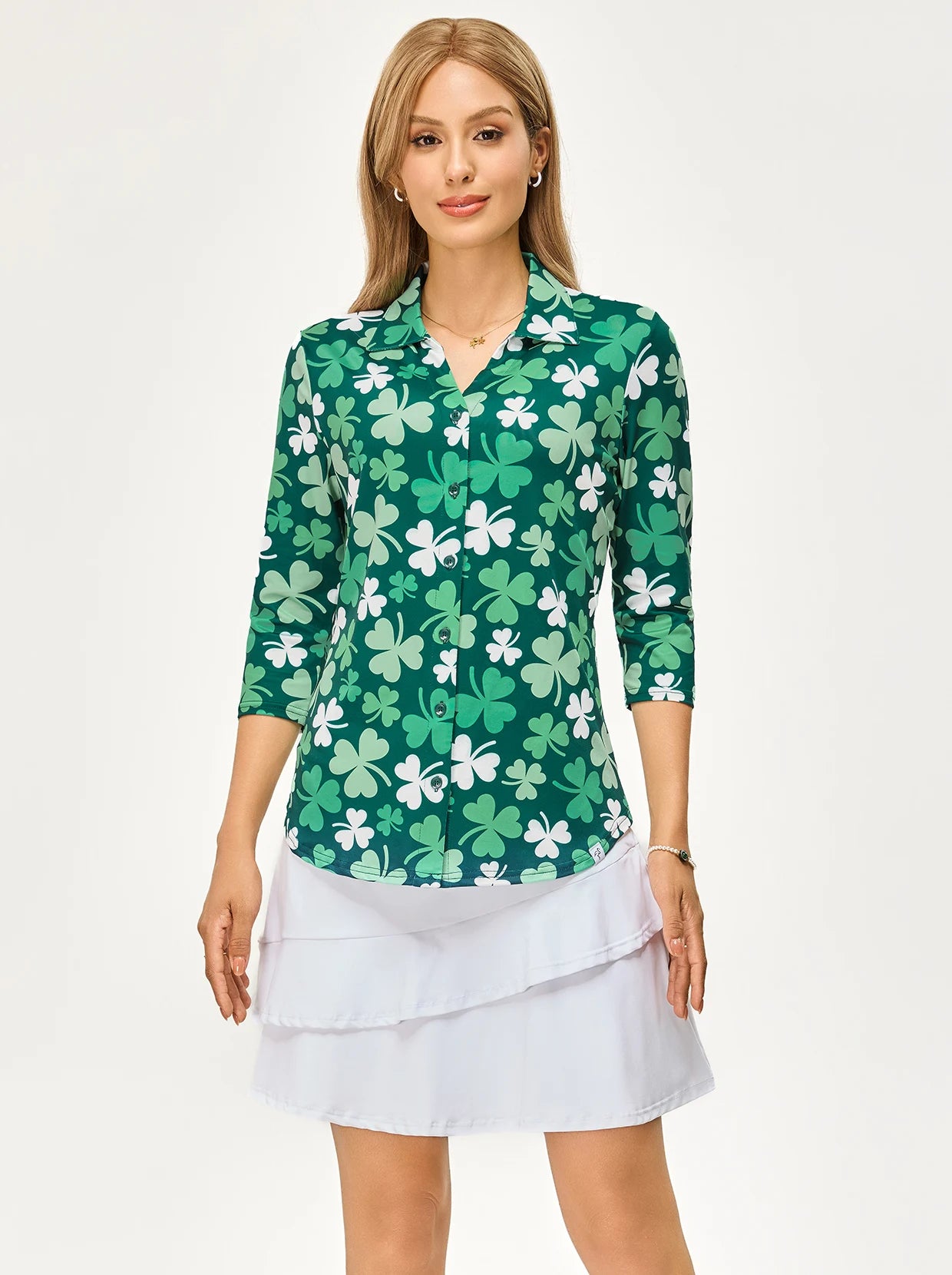 Green and White Shamrock V-neck Button-Down 3/4 Sleeve Polo Shirt