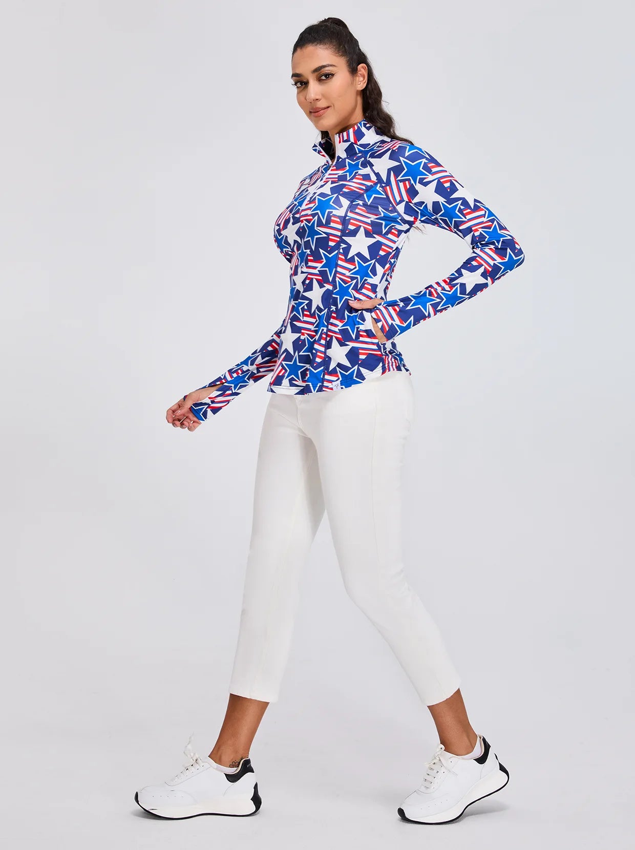 From casual outings to active adventures, our blue star quarter-zip long-sleeve shirt is a good choice. The lightweight, four-way stretch fabric allows for a full range of motion, while the thumbholes, stand-up collar, and quarter-zip design provide added protection. The handy side pockets are perfect for storing your phone, keys, or other small items.