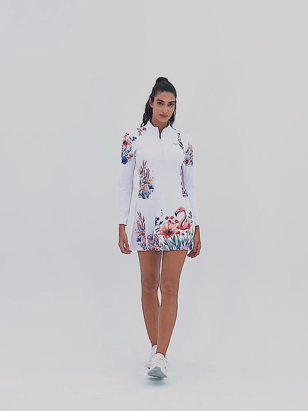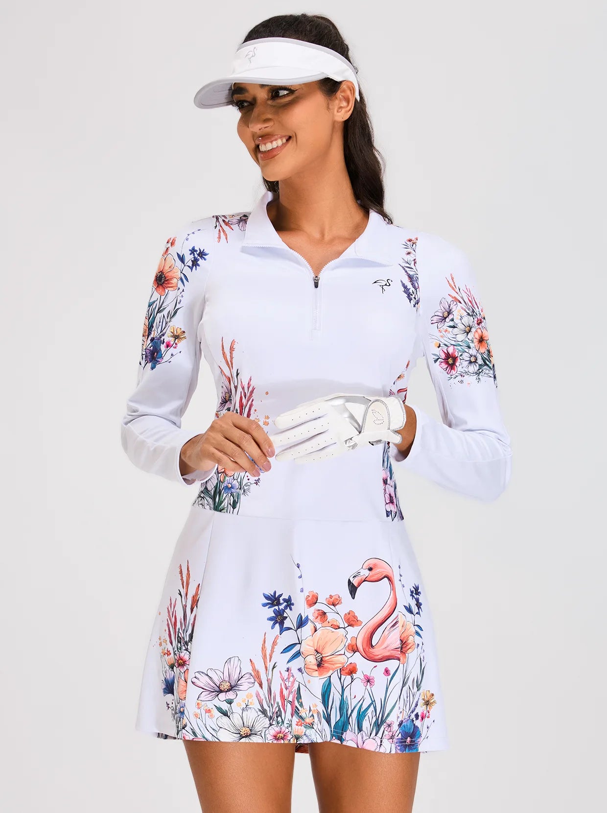 UPF50+ White Flamingo and Floral Breathable Quarter-zip 34" Long-sleeve Dress