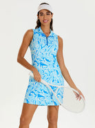 35" Blue Water Ripples Stand-collar Sleeveless Dress with Pockets