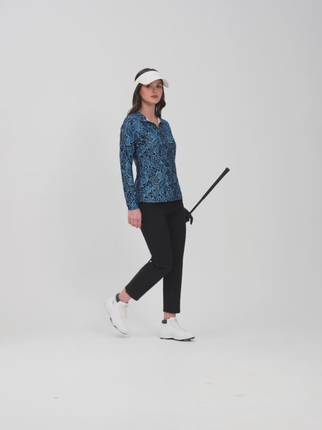 Rock the fairway or the streets in this Blue and Black Paisley Quarter-zip—where retro print meets modern performance. Featuring a crisp stand collar, raglan sleeves, and a stretch fabric blend that moves with you, this golf polo shirt keeps things cool and comfortable all day long. The moisture-wicking fabric keeps you cool and dry.. Classic paisley never goes out of fashion.