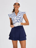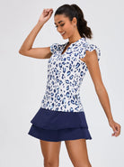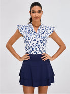 This stylish polo shirt features a unique blue leopard print design that is perfect for any occasion. Made with moisture-wicking, breathable, and soft material, it's comfortable to wear and helps keep you cool and dry. The 4-way stretch allows for maximum flexibility so you can move freely while playing golf, tennis, pickleball, or simply going about your day. The v-neck and ruffle sleeves add a touch of feminine charm to this versatile shirt. Available in red and blue, it's sure to become a new favorite in your wardrobe.