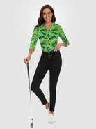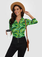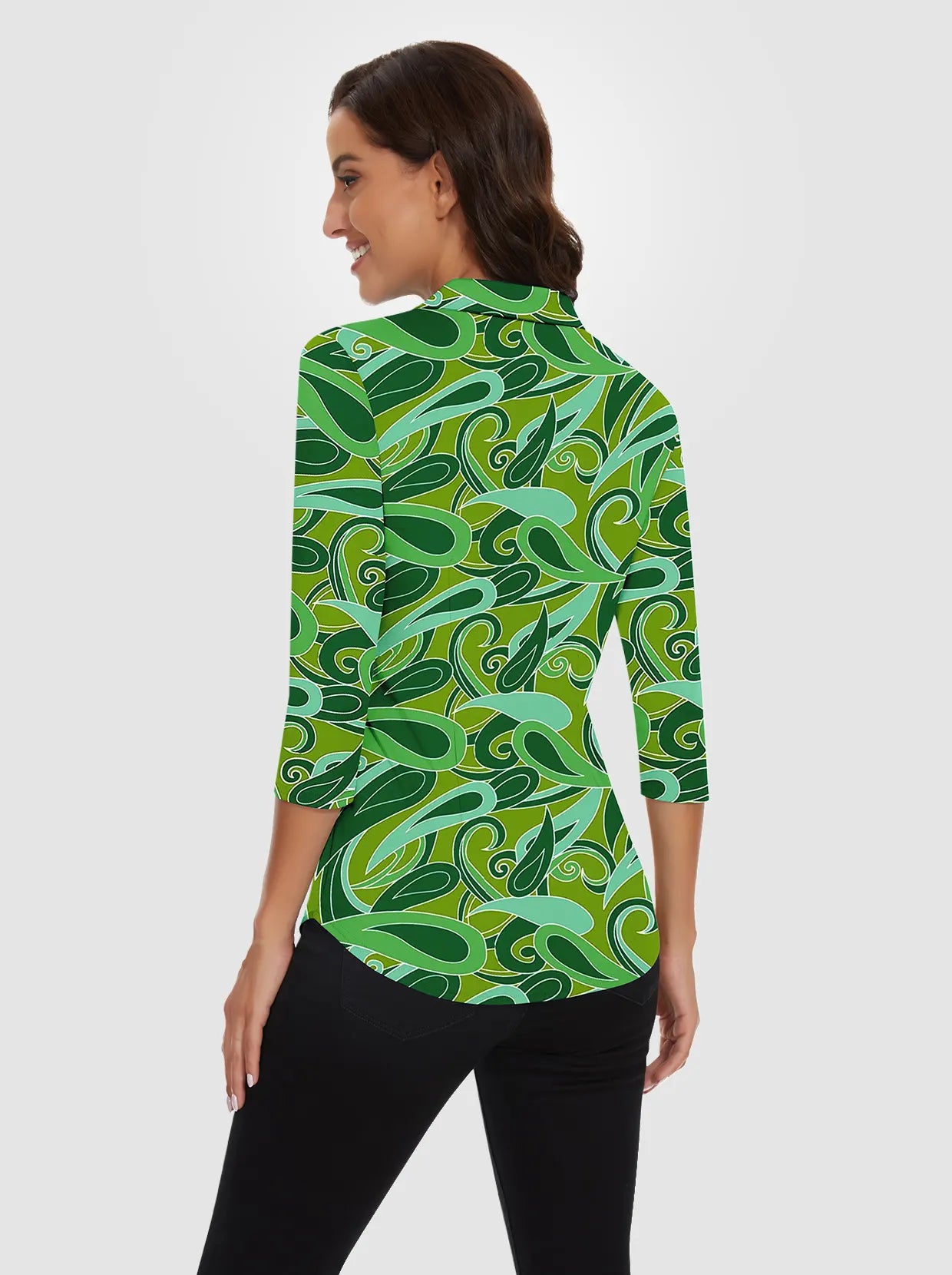 Green Print V-neck Button-Down 3/4 Sleeve Polo Shirt