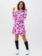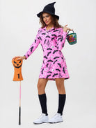 Haunt the town in our spooktacular women's long-sleeve polo dress. Featuring a playful pink and black bat print, this dress is perfect for celebrating Halloween. Crafted from soft, breathable, and stretchy fabric, it keeps you cool, dry, and comfortable all day. The convenient zippered pockets secure your essentials, while the unique Halloween-themed design adds a playful touch to your game or daily errands.