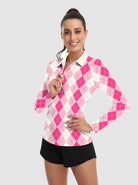 Get ready to mix fun and function with our Pink Checkerboard Quarter-zip Long-sleeve Polo! Made from soft, stretchy, and lightweight fabric that wicks moisture, this shirt keeps you cool and comfy. Its sleek quarter-zip collar and long sleeves make it a sporty favorite for golf, tennis, pickleball, or casual outings. With its playful pink and white checkerboard design, this polo effortlessly combines style and performance for your active days.