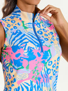 Unleash your inner nature with this tropical leopard print dress from our Call of the Wild Collection. This women's golf dress features a chic stand collar and a functional sleeveless design, blending fierce style with practical comfort. Discover more sleeveless dresses with pockets in our collection.