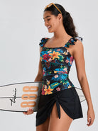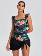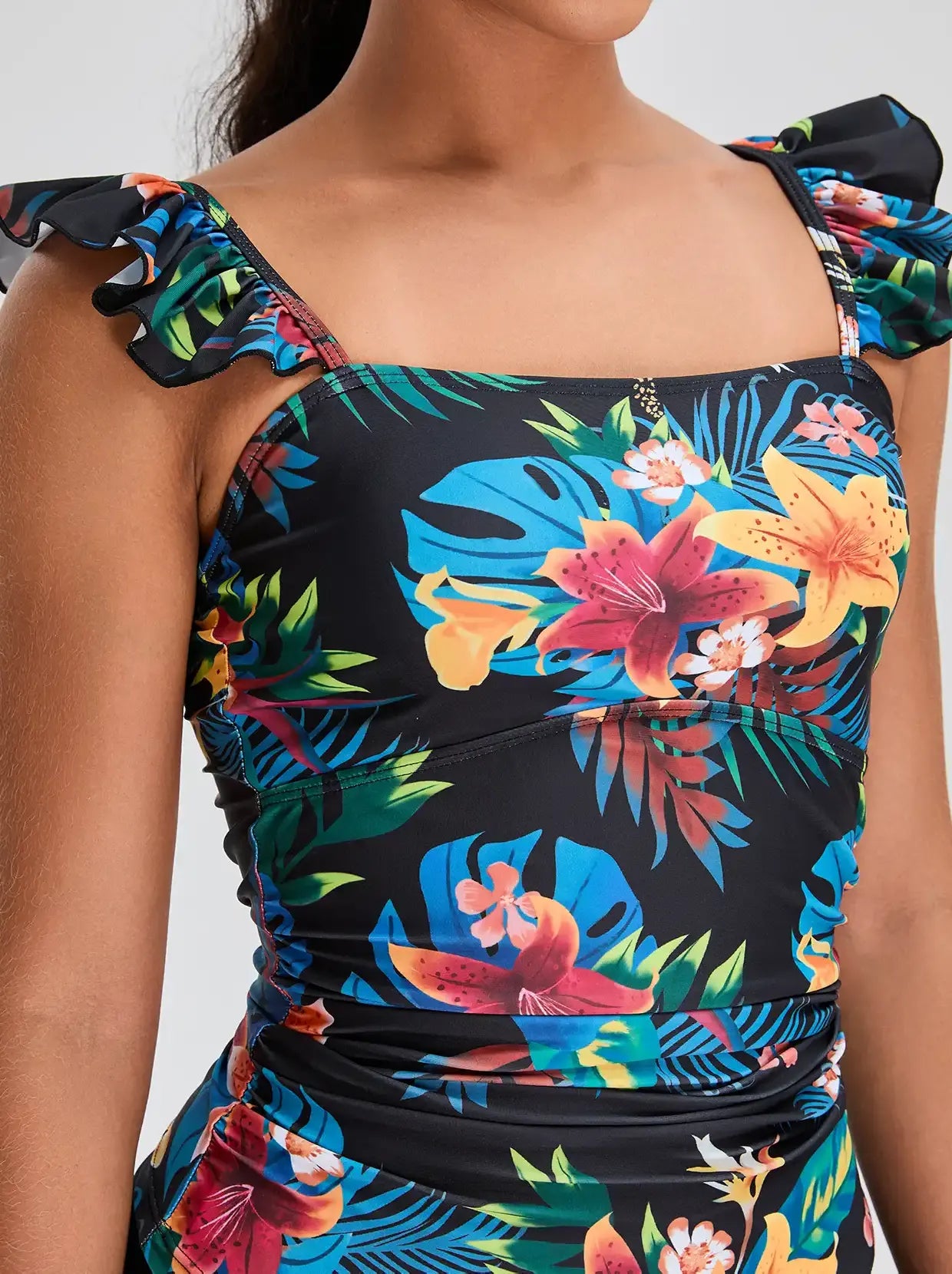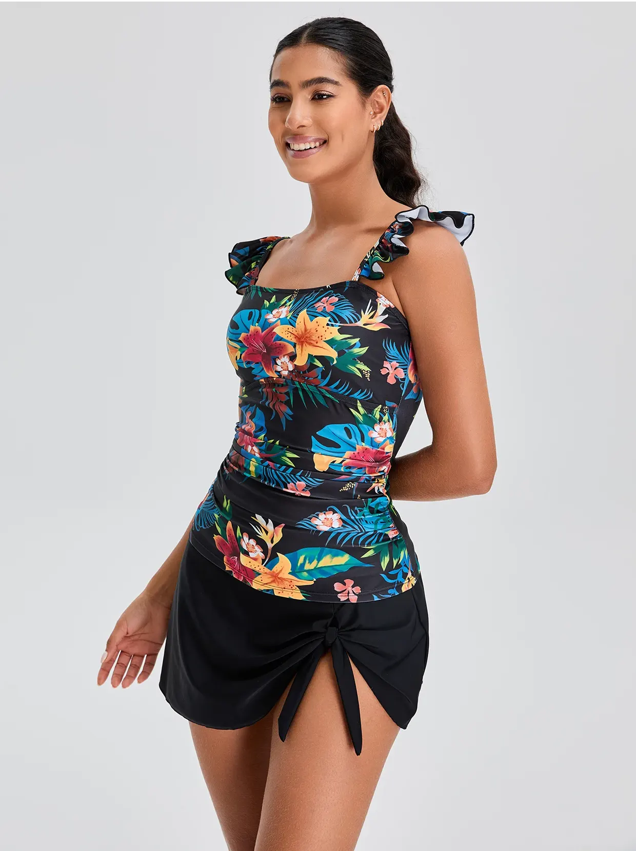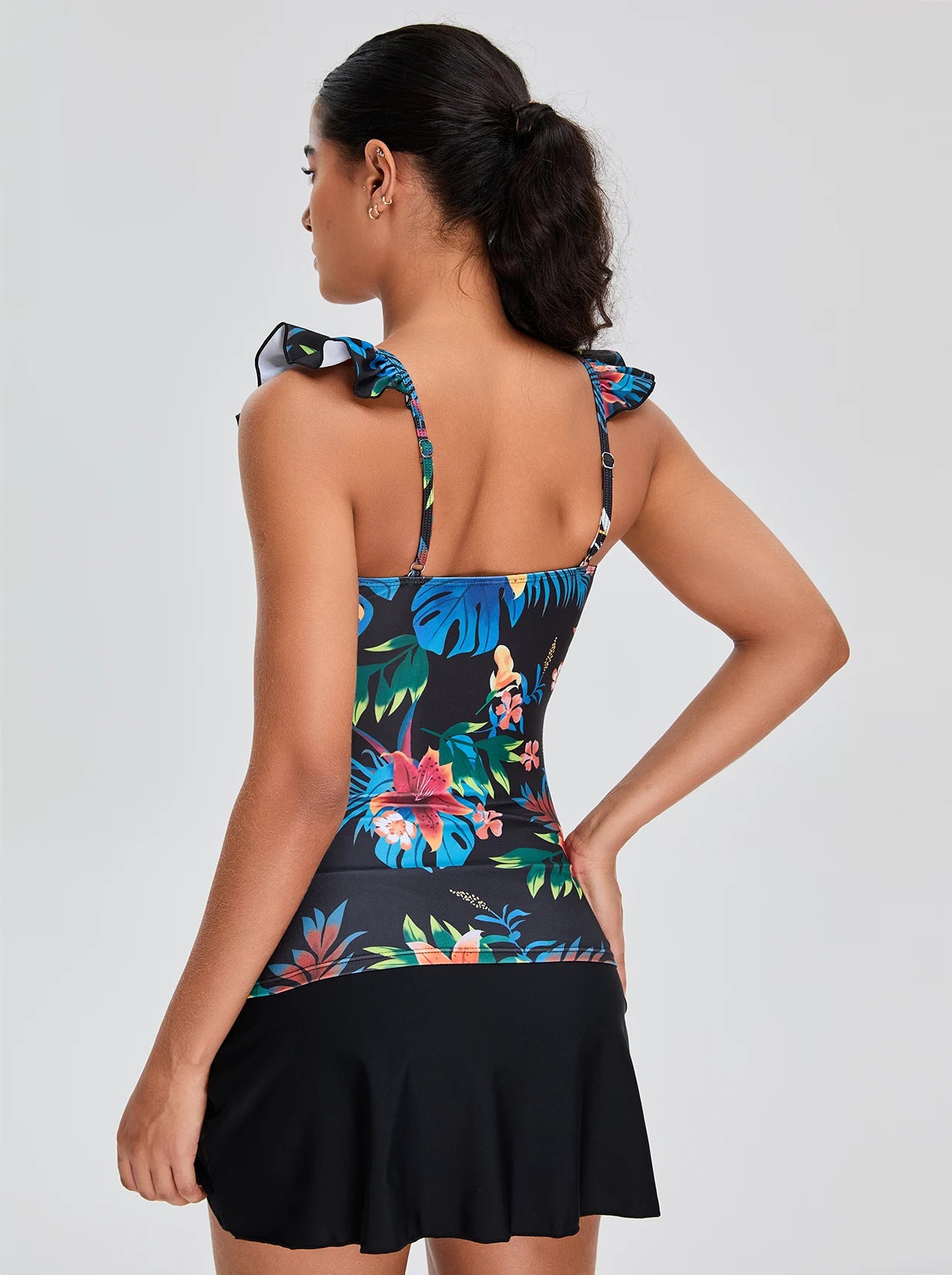 Colorful Floral Ruffled Tankini Top with Built-in Bra