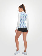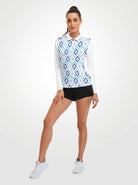 Blue Diamond Pattern Quarter-zip Long-sleeve Polo Shirt for Ladies