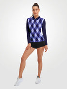 Dark Blue Checkerboard Quarter-zip Long-sleeve Polo Shirt for Women