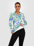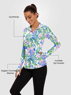 Pink and Blue Floral Quarter-zip Long-sleeve Fleece Tops for Women