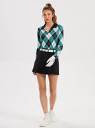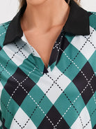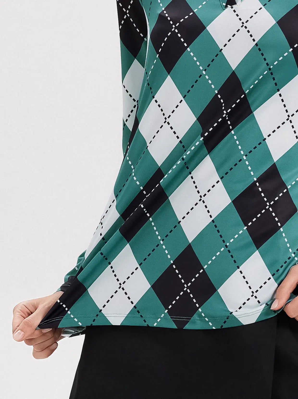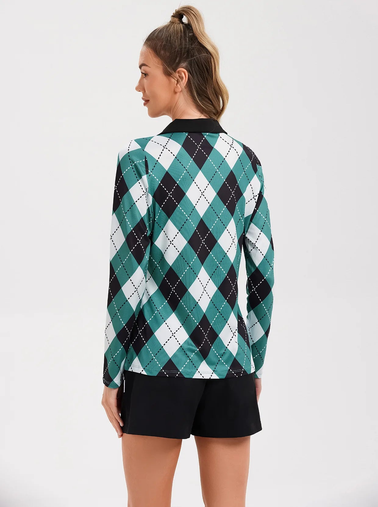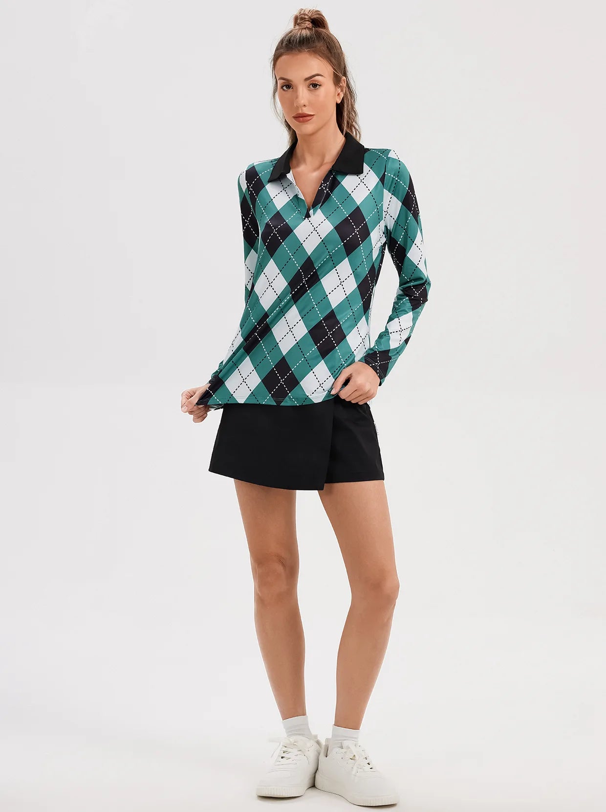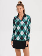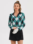 Green and Black Checkerboard V-Collar Long-sleeve Polo for Women