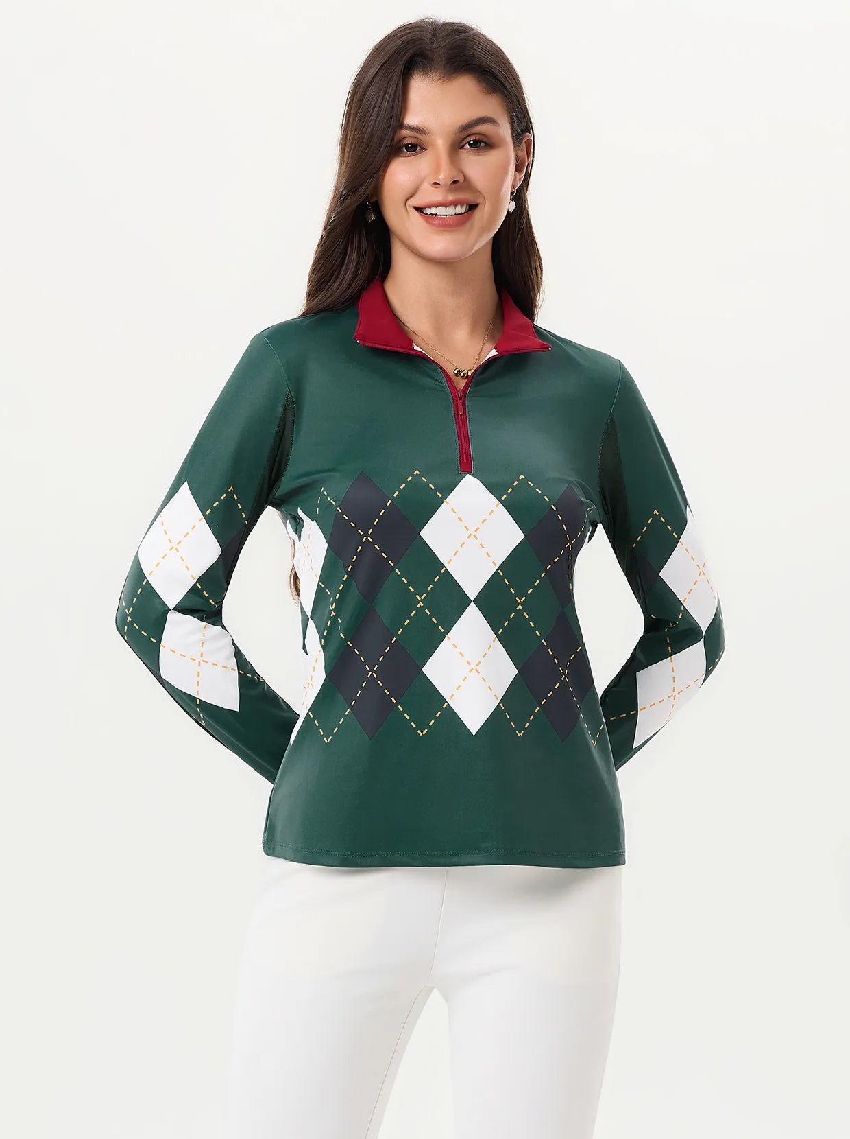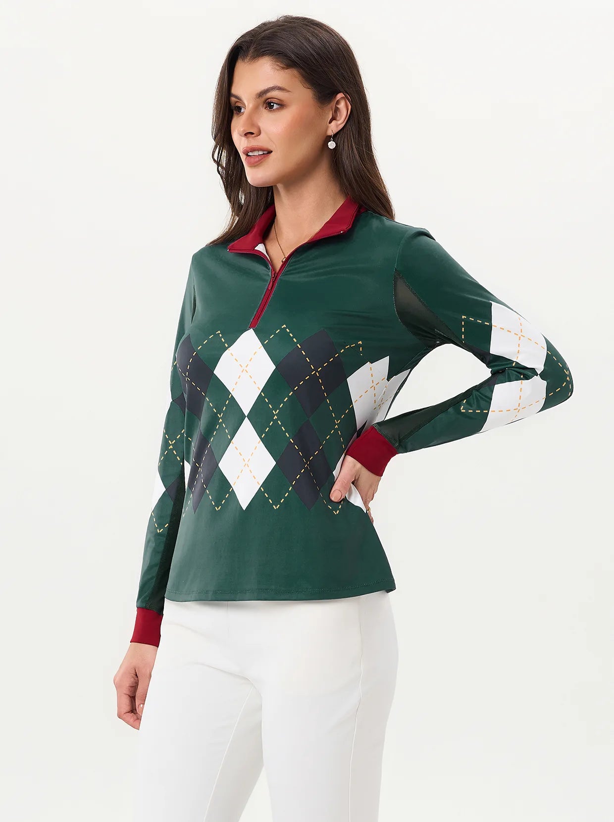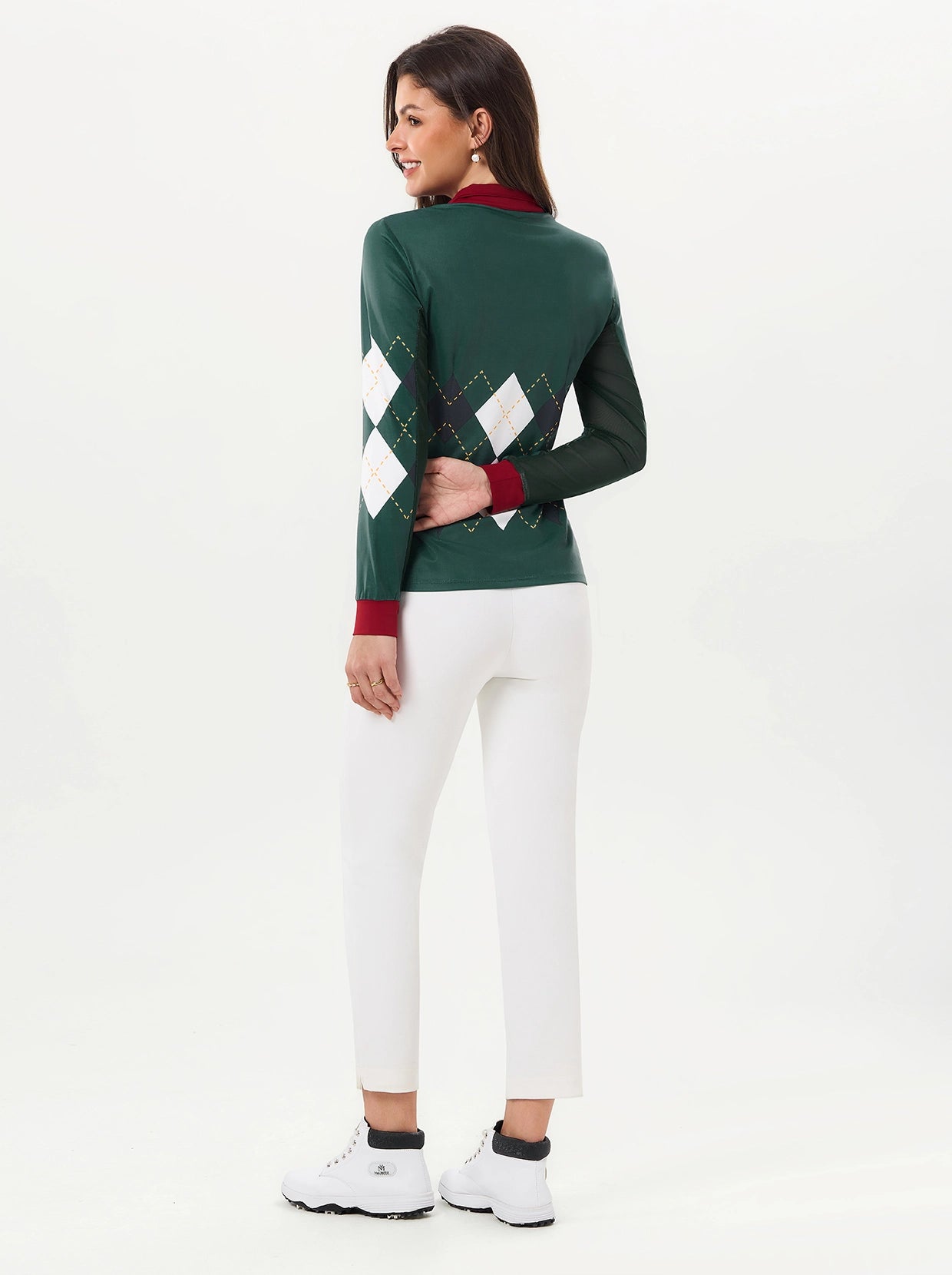 Green Checkerboard Half-Mesh Long-sleeve Polo Shirt