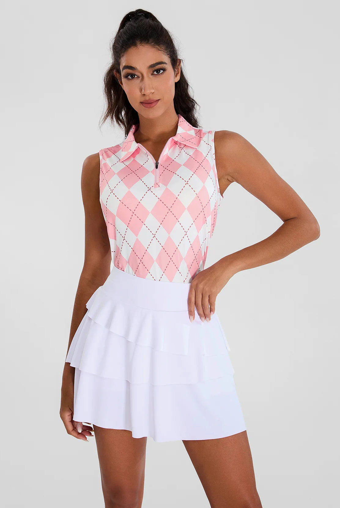 Pink Floral Quarter-zip Ruffled Sleeveless Rash Guard For Women