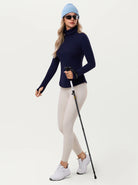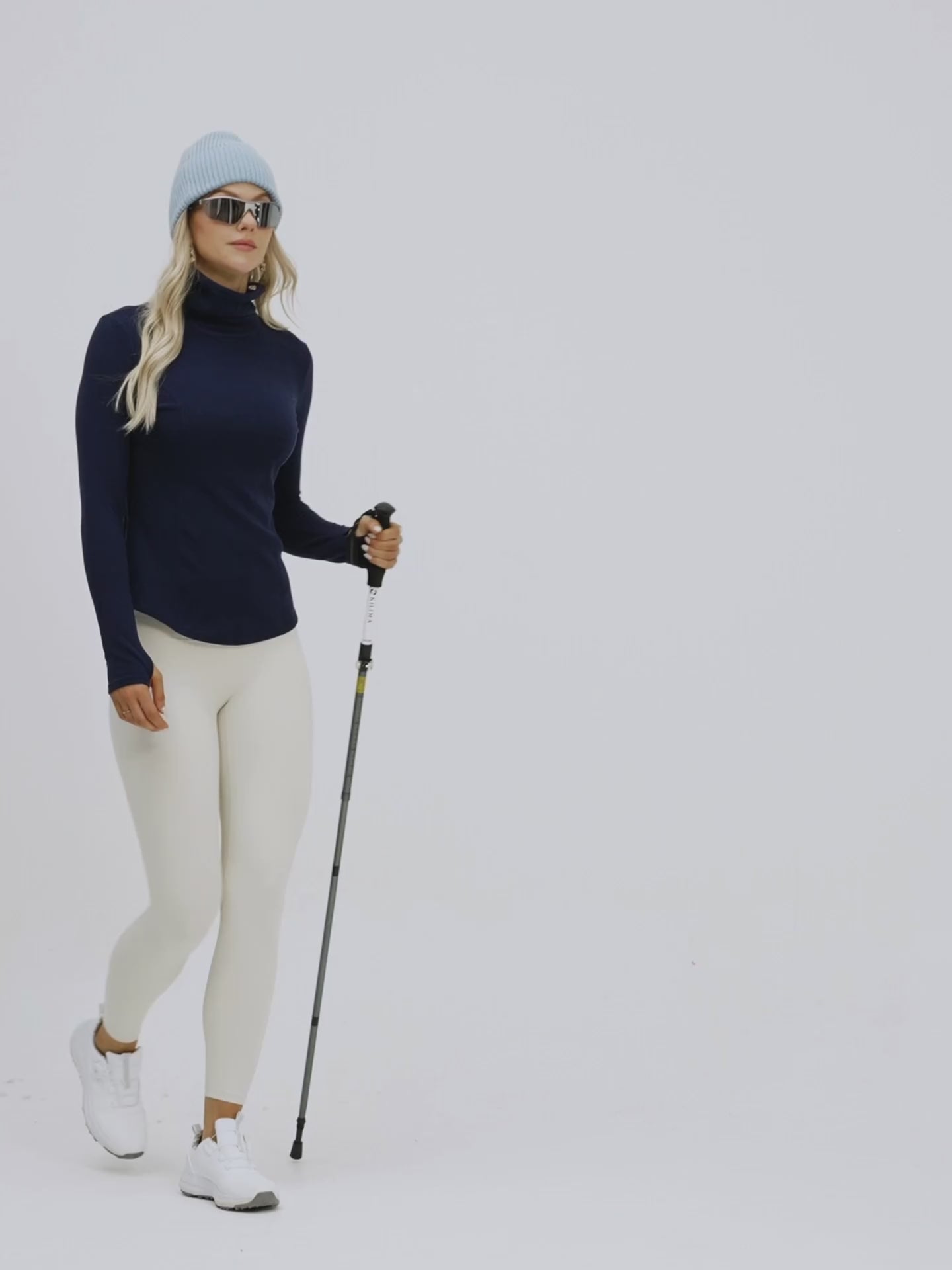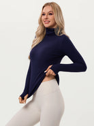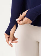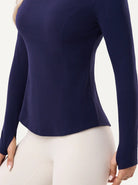 Get cozy in this solid long-sleeve thermal top. This navy long-sleeve thermal top, featuring a cozy cowl neck, is perfect for keeping warm on your adventures. Featuring thumb holes for added comfort, a windproof mask to block the breeze, and a curved hem for a flattering fit, it’s soft, stretchy, and great for layering or rocking on its own. Ideal for hiking or just everyday fun!
