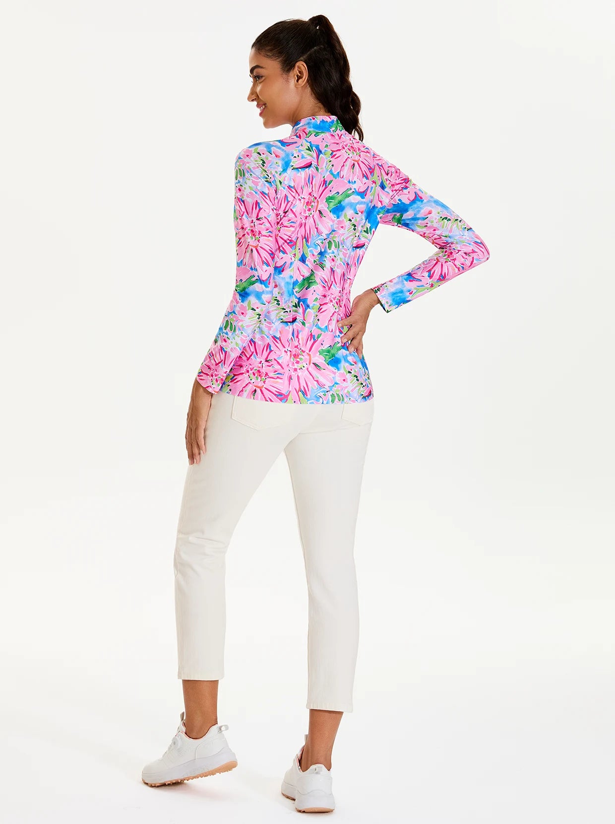 Blossom on the green with our pink floral long-sleeve polo. This beautiful top features raglan sleeves and high-stretch materials, ensuring a full range of motion. Made from lightweight, breathable, and moisture-wicking fabric, it’s designed to keep you cool, dry, and comfortable, whether you're playing a round of golf, a game of tennis, or just enjoying a casual day out.