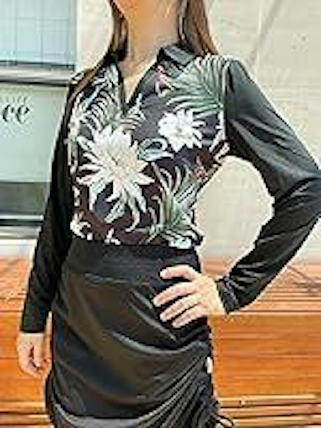 White Floral V-Neck Long-sleeve Golf Polo Shirt for Women