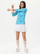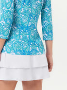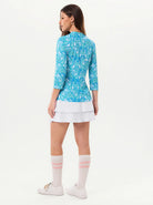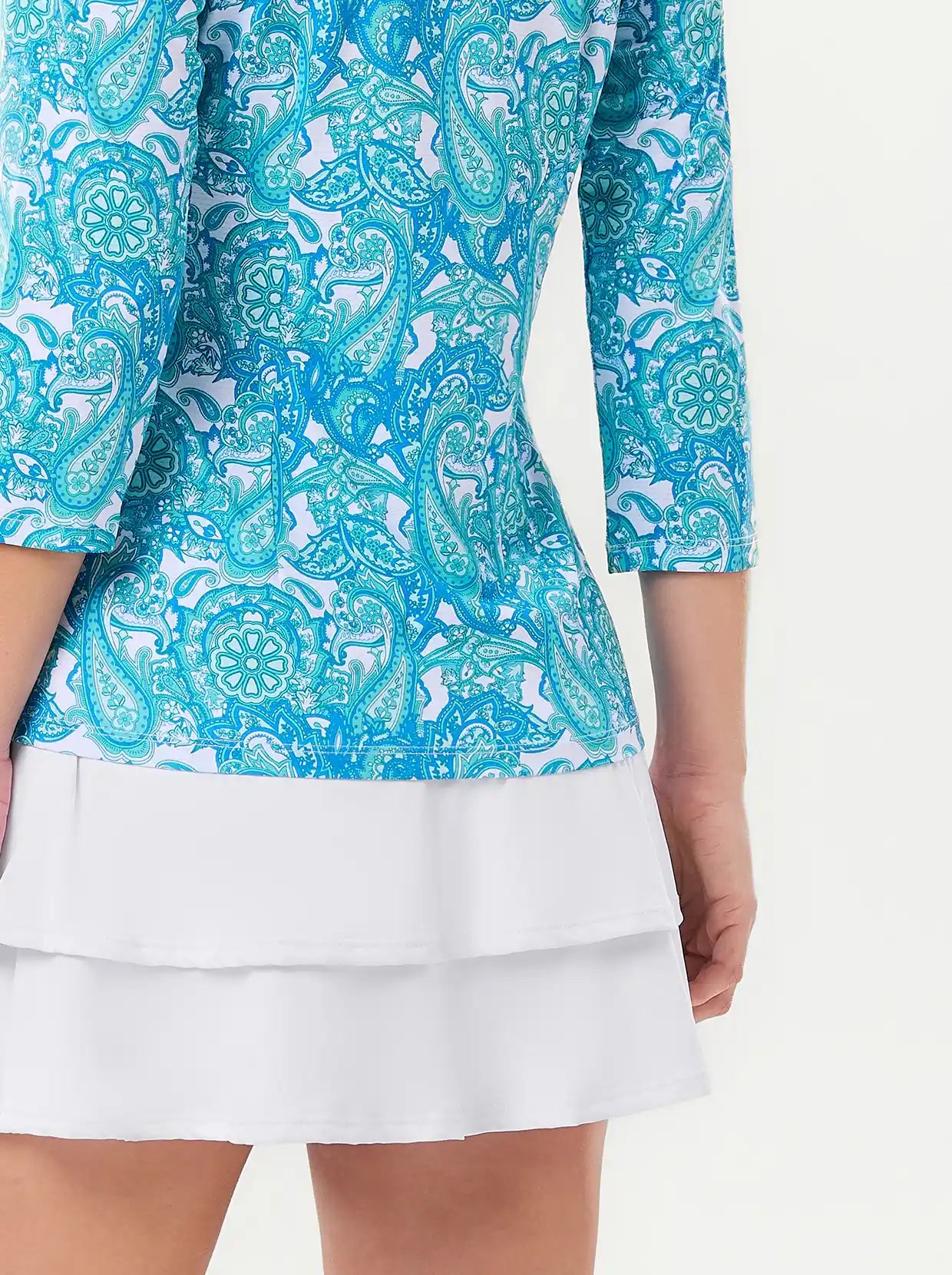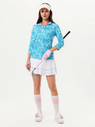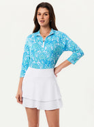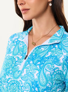 Elevate your athletic wardrobe with this vibrant green paisley polo. Engineered with 4-way stretch and moisture-wicking technology, it keeps you dry and mobile. The raglan sleeves and princess seam deliver a refined fit that flatters every frame, while the breathable fabric ensures all-day comfort. Rock the quarter-zip stand collar and 3/4 sleeves for a modern edge that works on the golf course, tennis court, pickleball arena, or weekend hangouts.