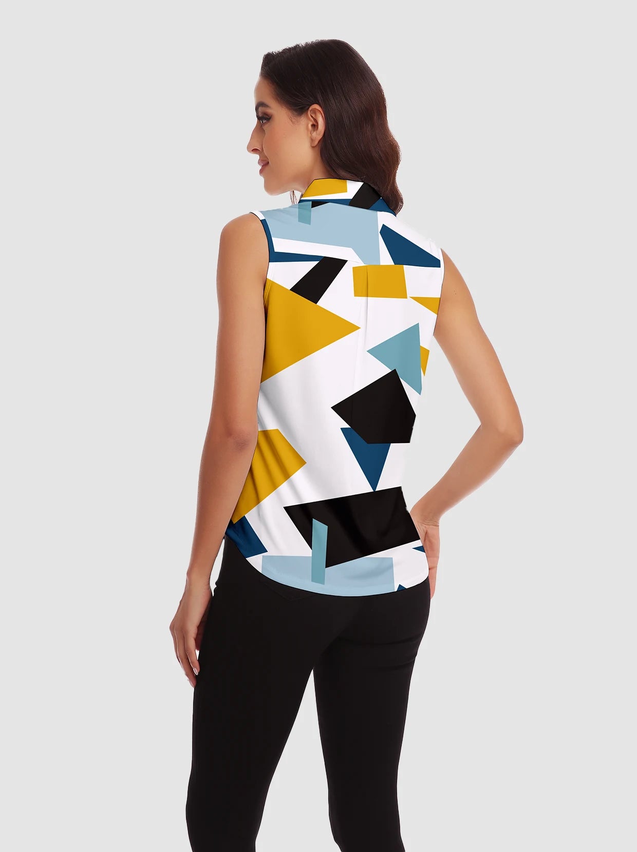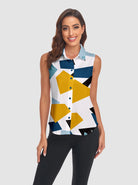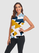 Stay active and stylish in our Geometric Print Sleeveless Polo. Designed for your dynamic life, its breathable, lightweight fabric offers comfortable 4-way stretch that moves with you. The soft texture feels great, while the flattering curved hem and classic button-down collar create a polished look. Featuring vibrant blue, yellow, and white geometric patterns, it's perfect for golf, tennis, pickleball, or casual wear, ensuring you feel confident and comfortable.