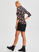 Halloween Pumpkin Ghost V-Neck Button Down 3/4 Sleeve Shirt for Women
